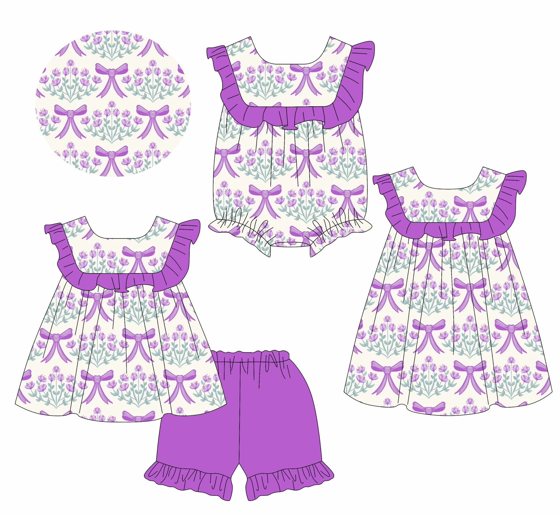 1.11 custom each style moq 5eta 4-6week Sibling Sister floral bow baby girl short sleeve shorts sets and dress and rompers match family design