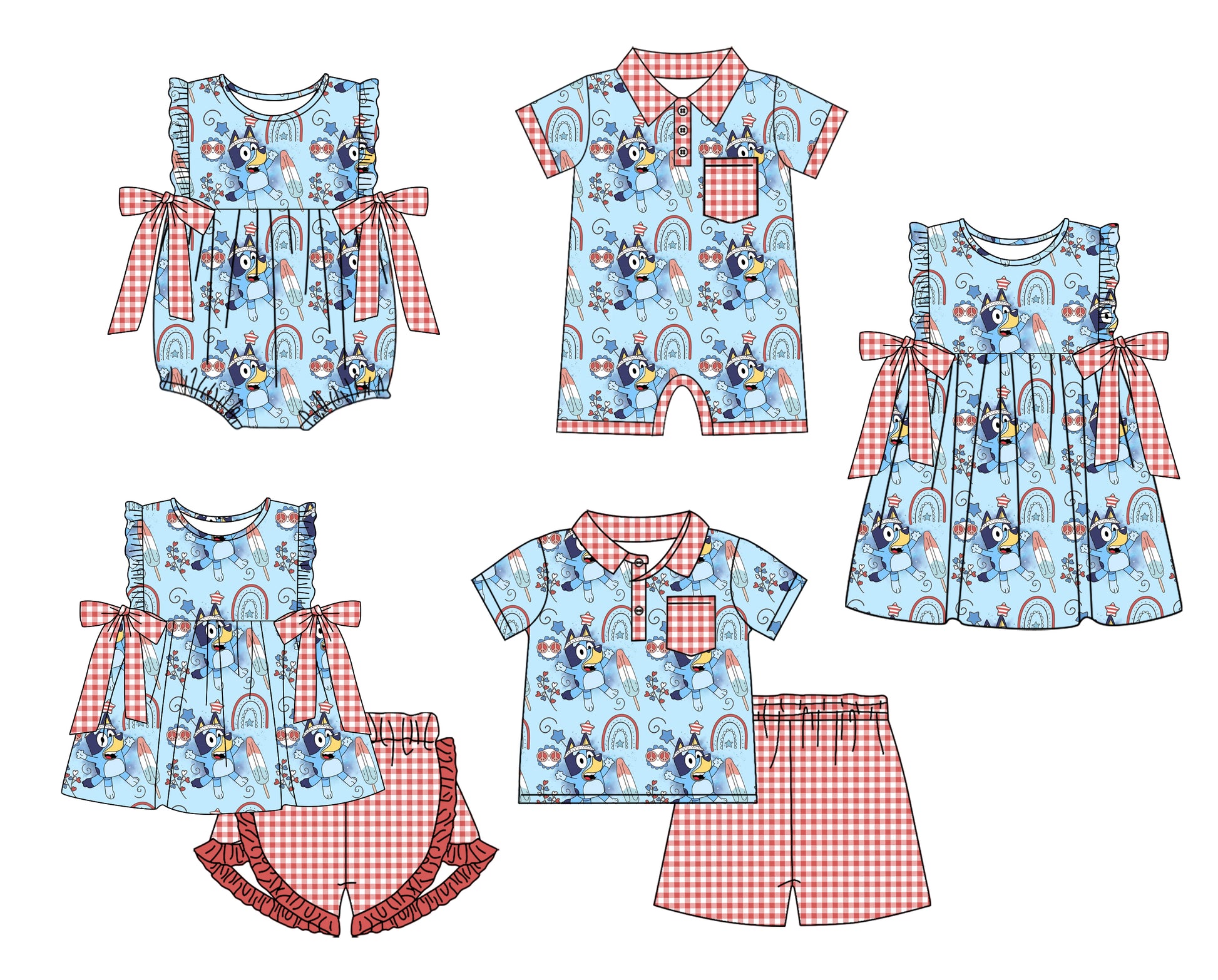 1.7 custom each style moq 5eta 4-6week Sibling Sister cartoon dog baby girl short sleeve shorts sets and sets 2 and boy romper and girl romper and dress match design