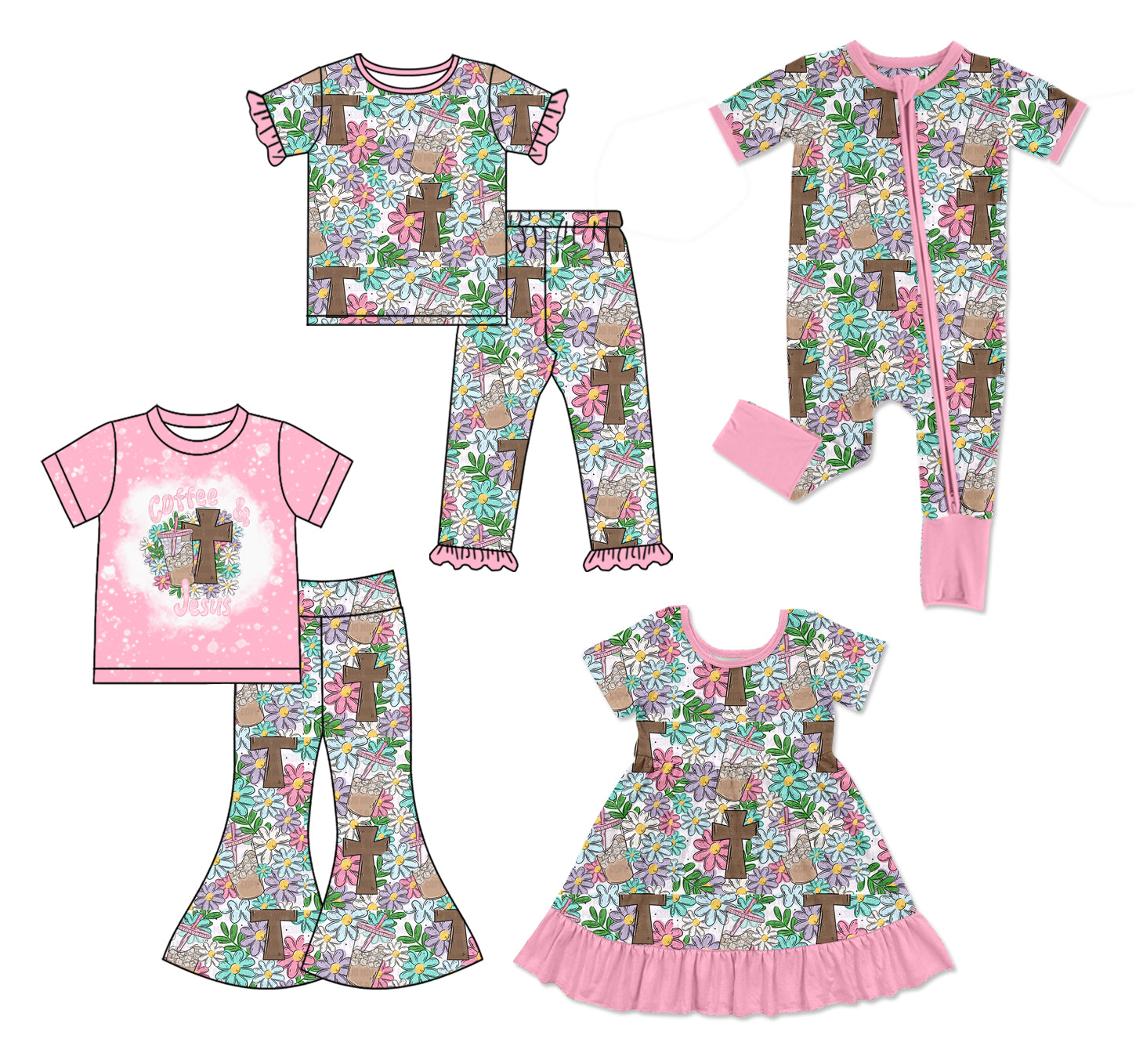 25.11.28 custom each style moq 5 eta 6-8week Sibling Sisters bunny floral baby girl short sleeve pants sets 2 and dress and rompers match family design