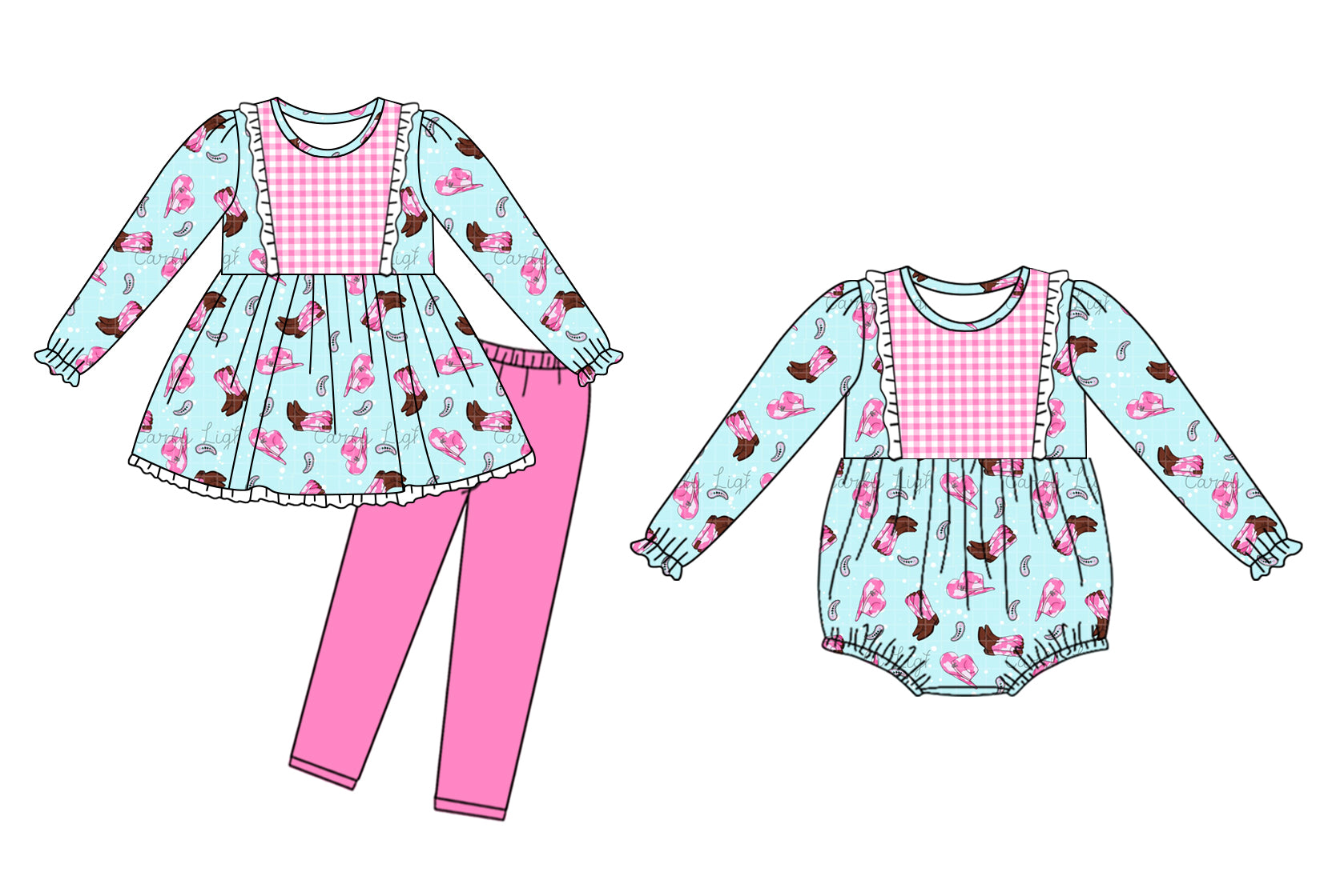 25.9.1 custom each style moq 5eta 4-6week Sibling Sisters boot baby girl clothes long sleeve pants sets and romper match family design
