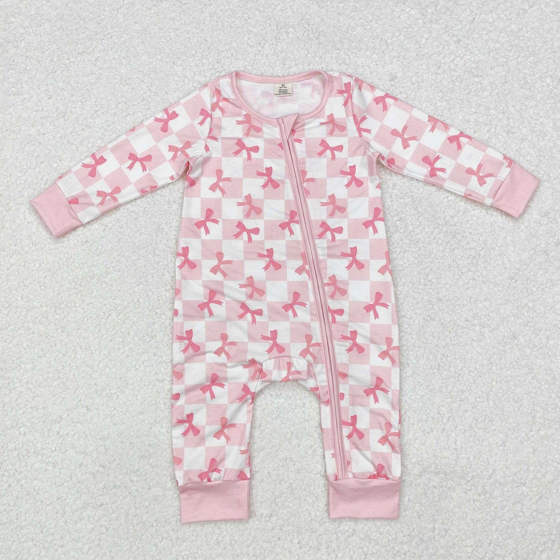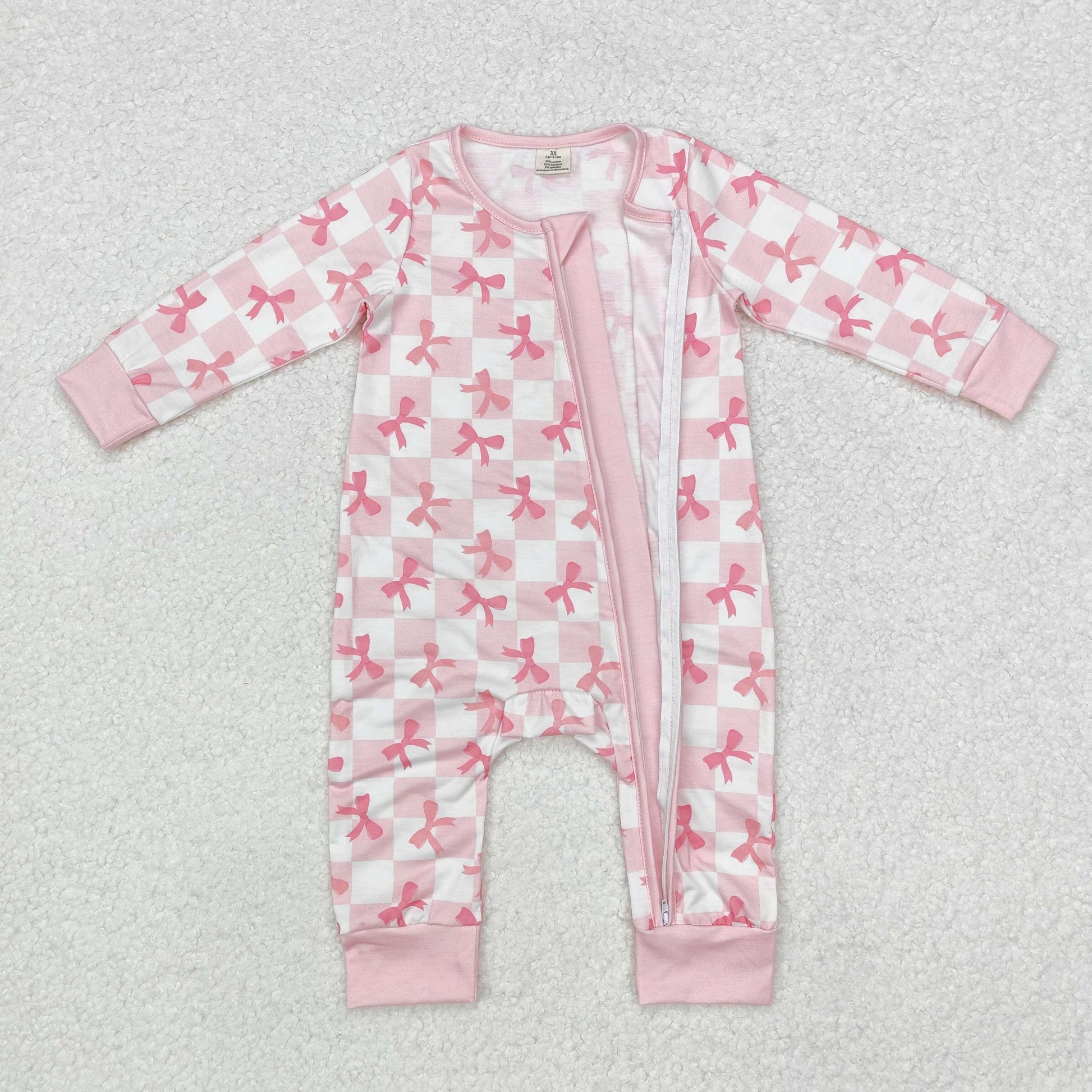 BAMBOO RTS NO MOQ ETA 5/7days Arrived LR1607 Modal bow light pink plaid zipper long-sleeved jumpsuit