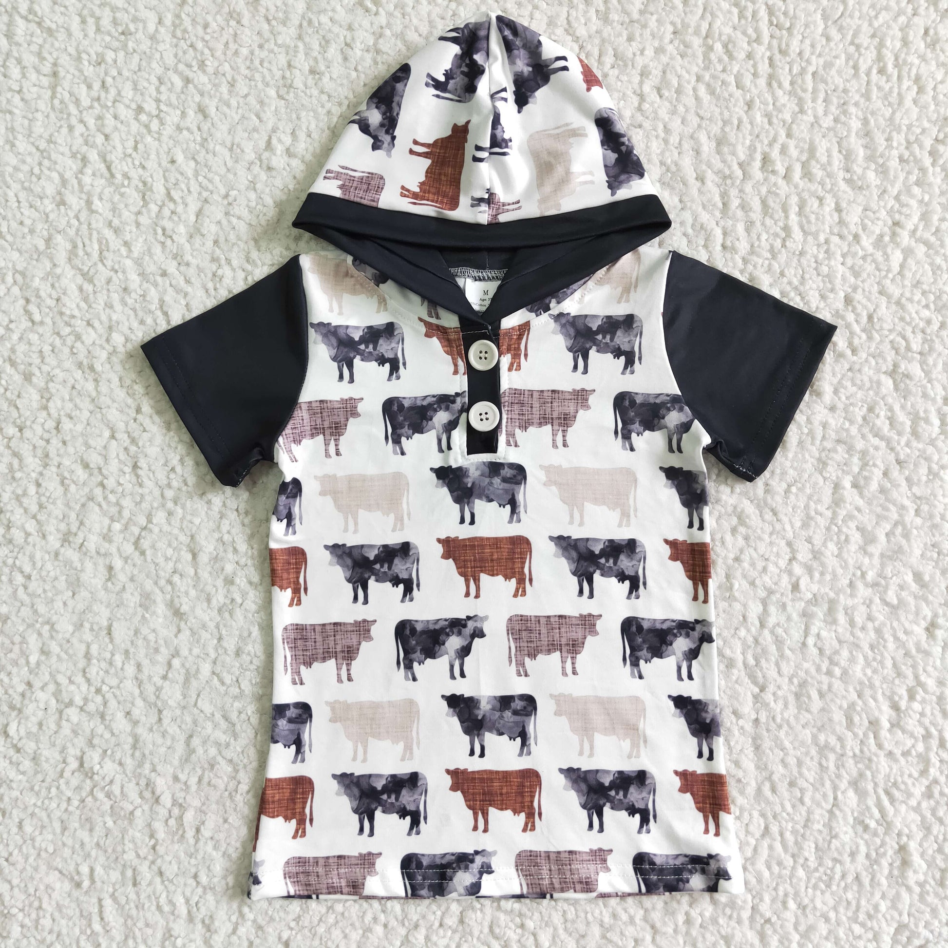 RTS NO MOQ(In Stock) BT0009 Boys Black Short Sleeve Hooded Cow Button Top