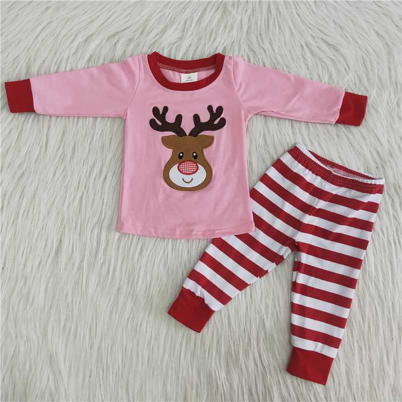 Christmas embroidery deer pink long sleeve pants set