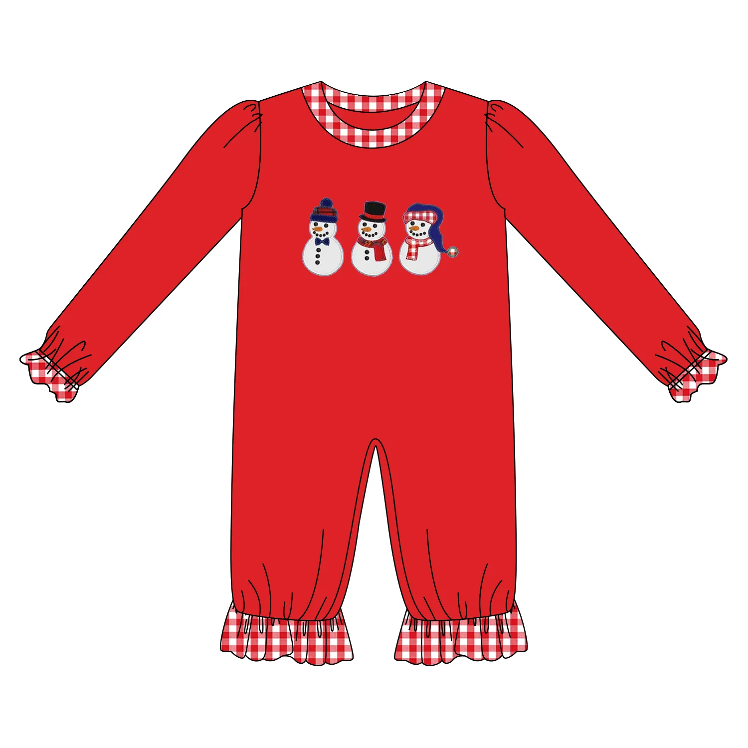 Custom moq 3 eta 7/8week moq 5 eta /4/5week Three Shapes Snowman Pattern Red Ruffled Lace Cuffs Long Romper