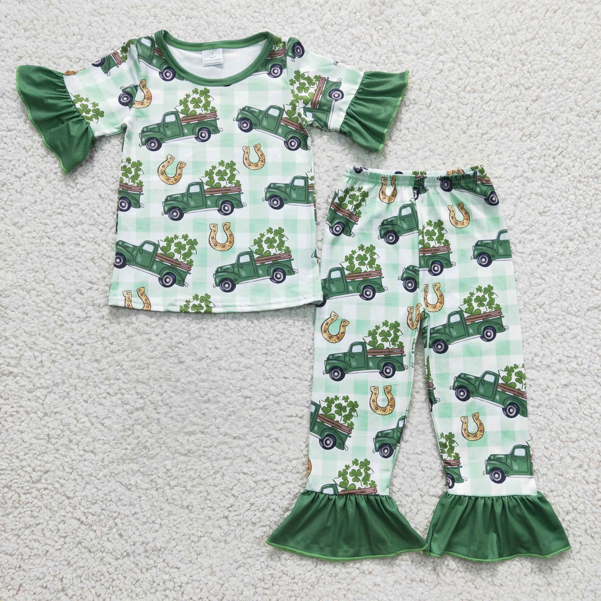 GSPO0287 Girls green car four-leaf clover short-sleeved trouser suit
