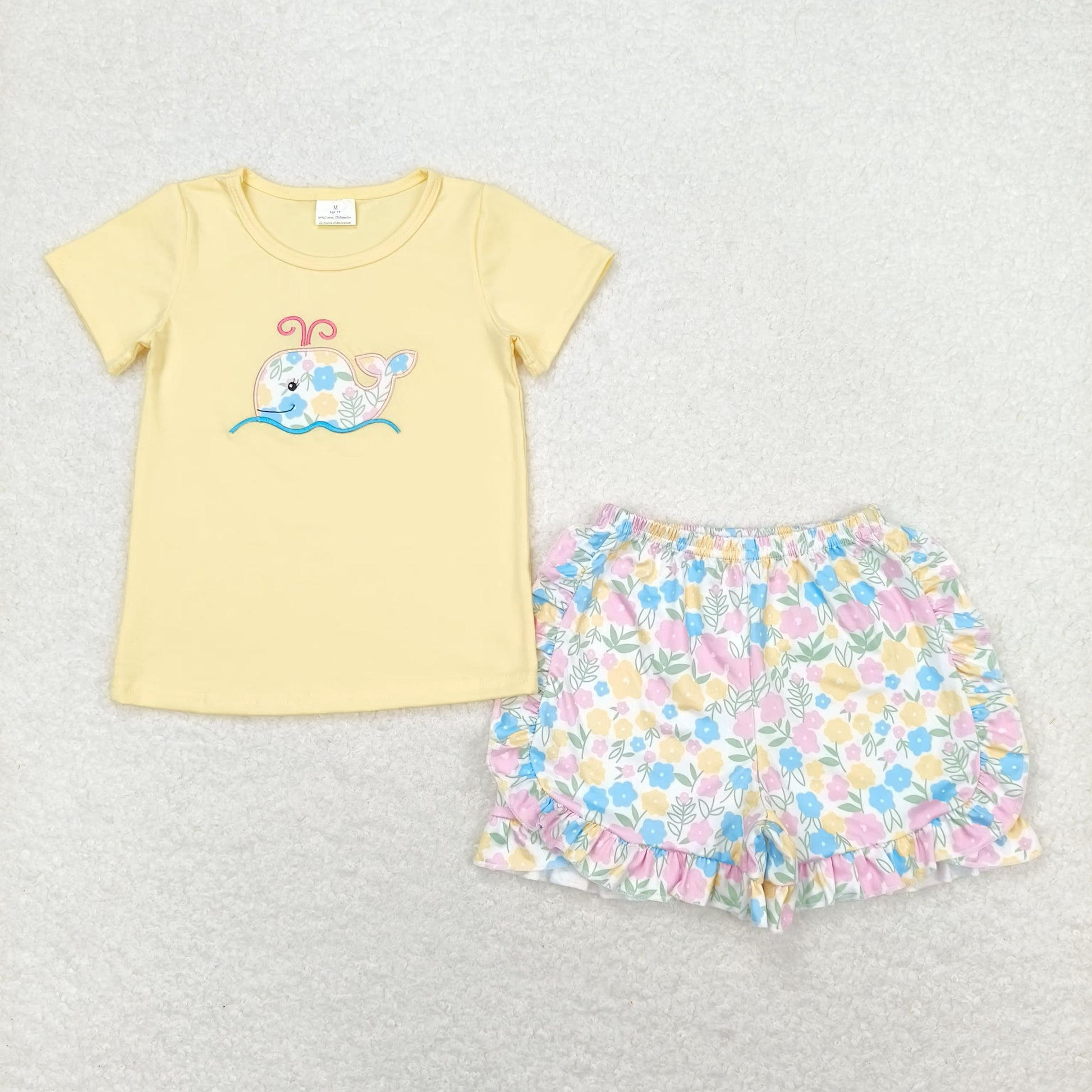 GSSO0765 Embroidered flower whale yellow short-sleeved shorts set