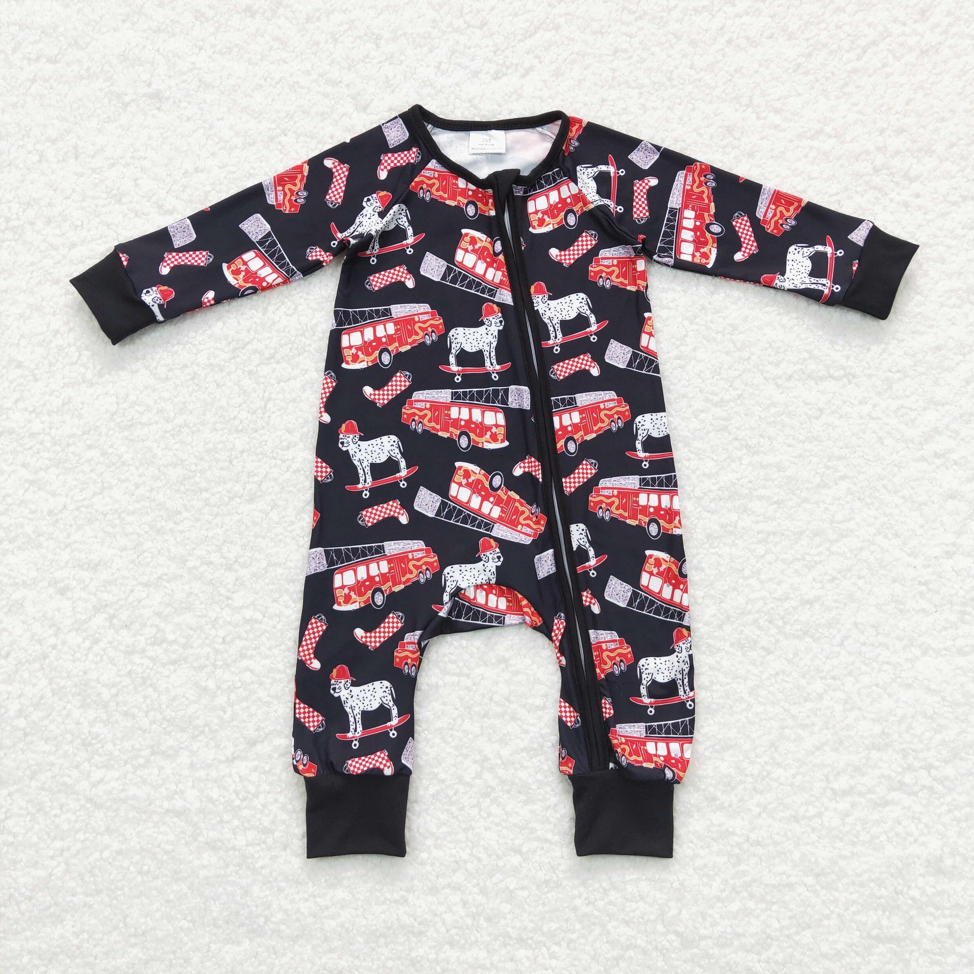 LR0735 Fire Truck Dalmatian Navy Blue Zip Long Sleeve Jumpsuit