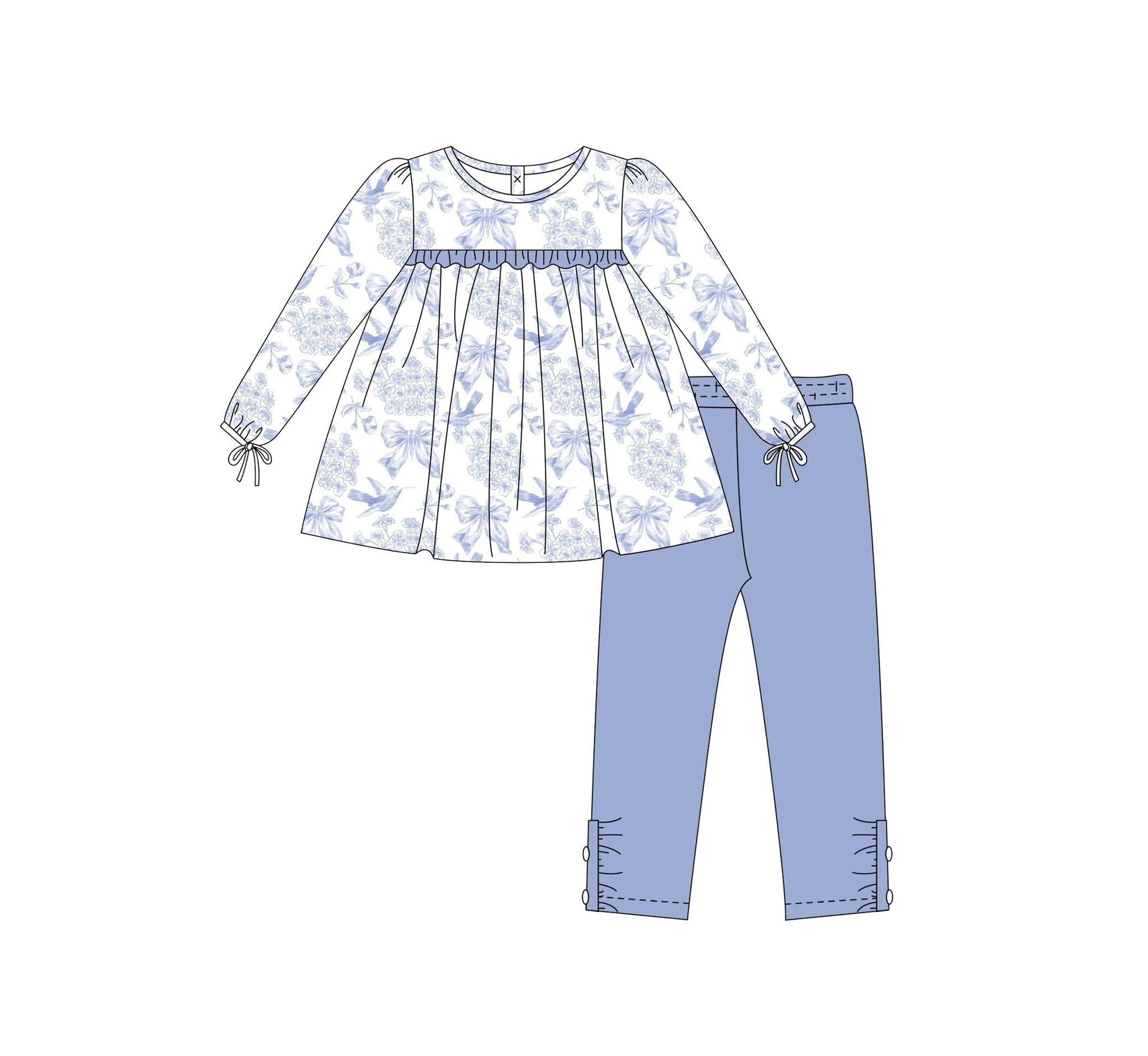 NO MOQ sales GLP2478 Pre-order baby girls clothes bow floral blue long sleeve pants sets-2025.6.12