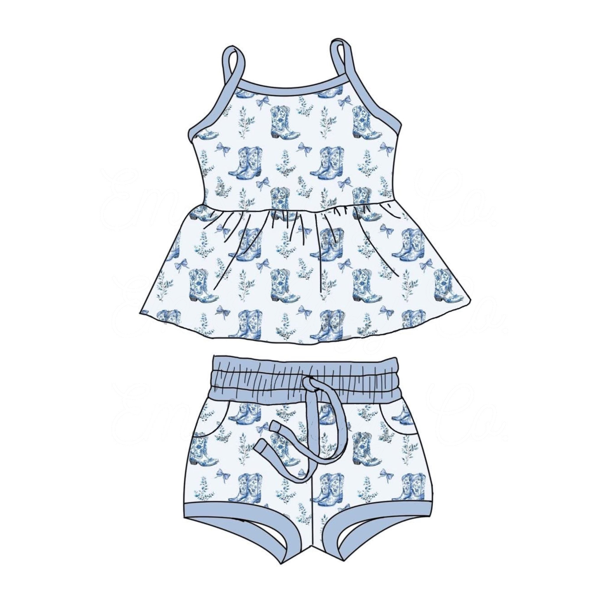 (Pre Order) No moq GSSO2750 PRE-ORDER baby girls clothes boot bow blue suspender shorts set-2025.10.13