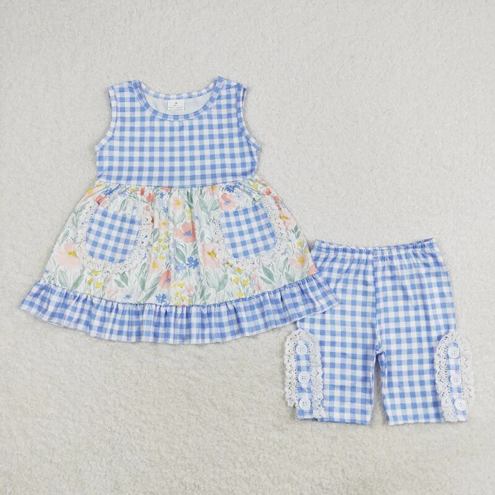RTS NO MOQ Baby Girls Blue Flowers Checkered Sibling Rompers Dresses Clothes Sets