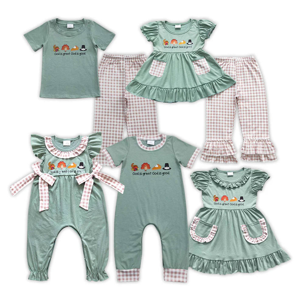 RTS NO MOQ Baby Sibling Thankgiving Clothing God Is Great God Is Good Thanksgiving turkey pure cotton top hot stamping eating turkey festival