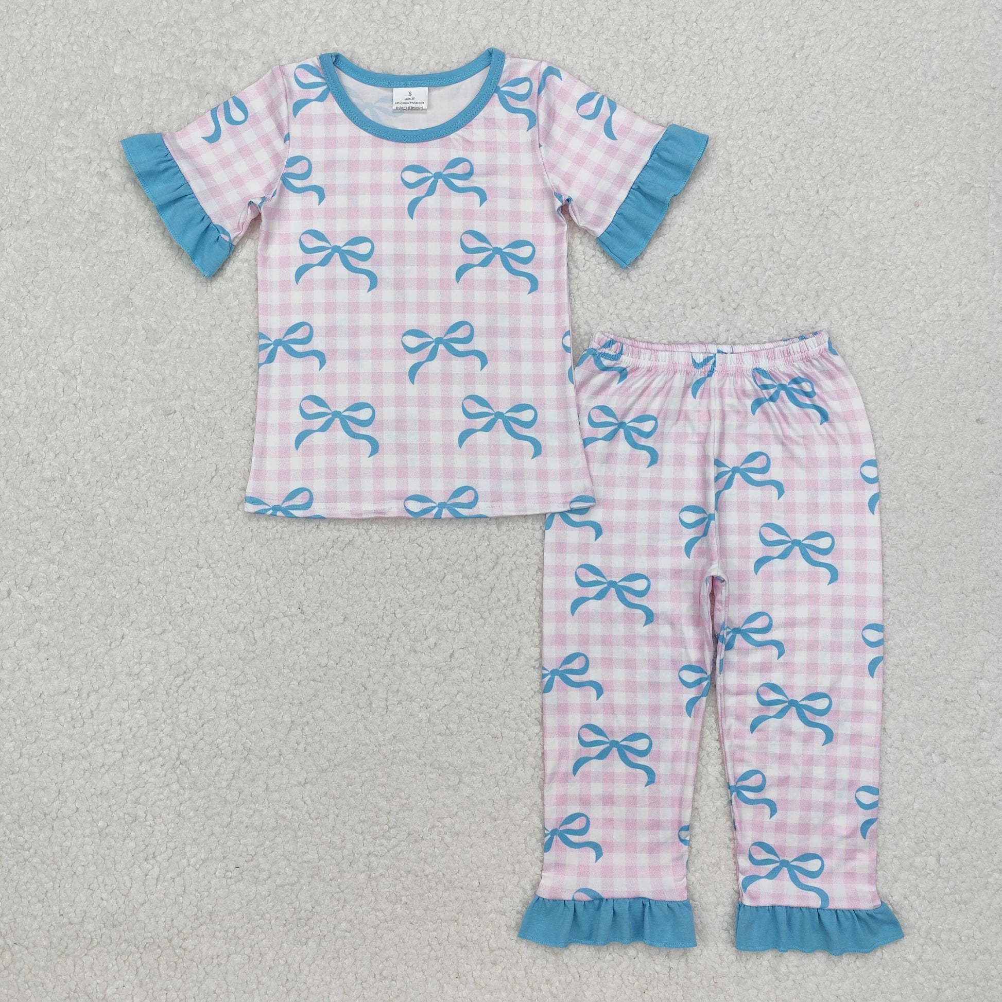 RTS NO MOQ ETA 5/7days Arrived GSPO1736 Bow pattern blue lace pink plaid short-sleeved trousers pajama set