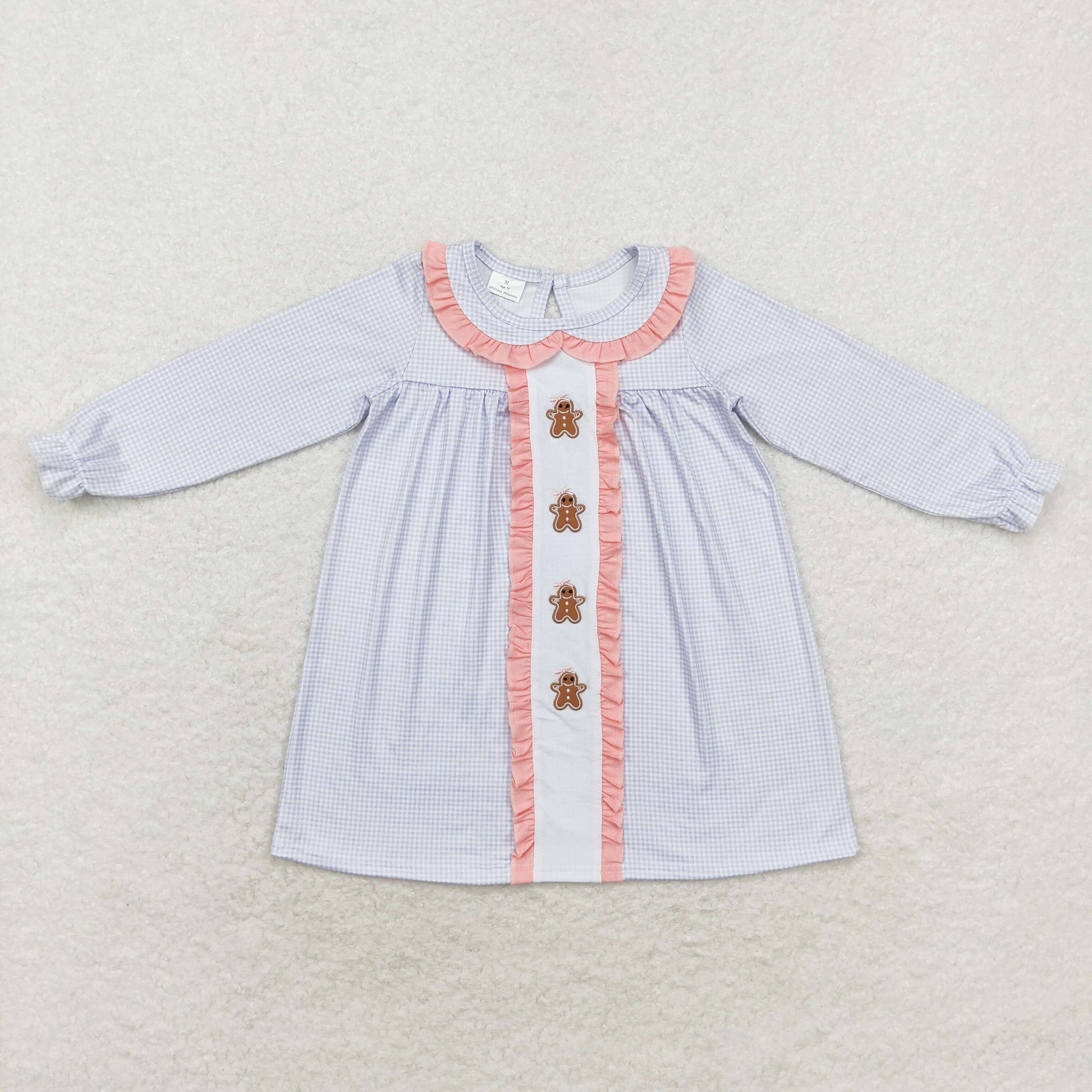 rts no moq GLD0571 Embroidered gingerbread man pink lace doll collar blue plaid long-sleeved dress