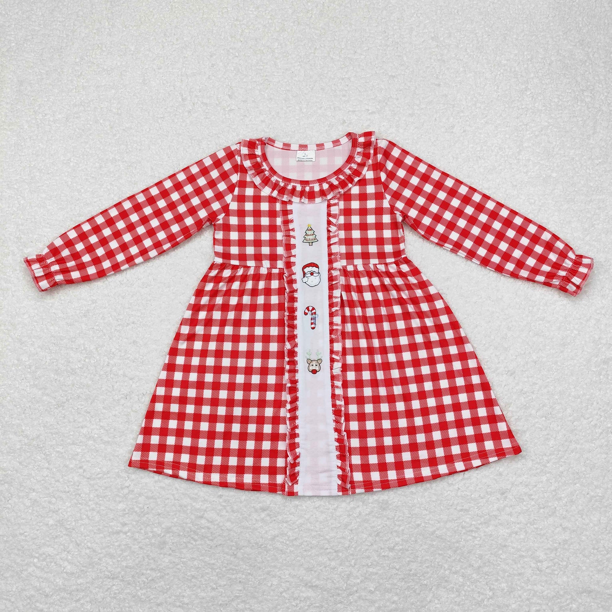 rts no moq GLD0634 Embroidered Christmas tree, old man with cane, deer, red plaid lace long-sleeved dress