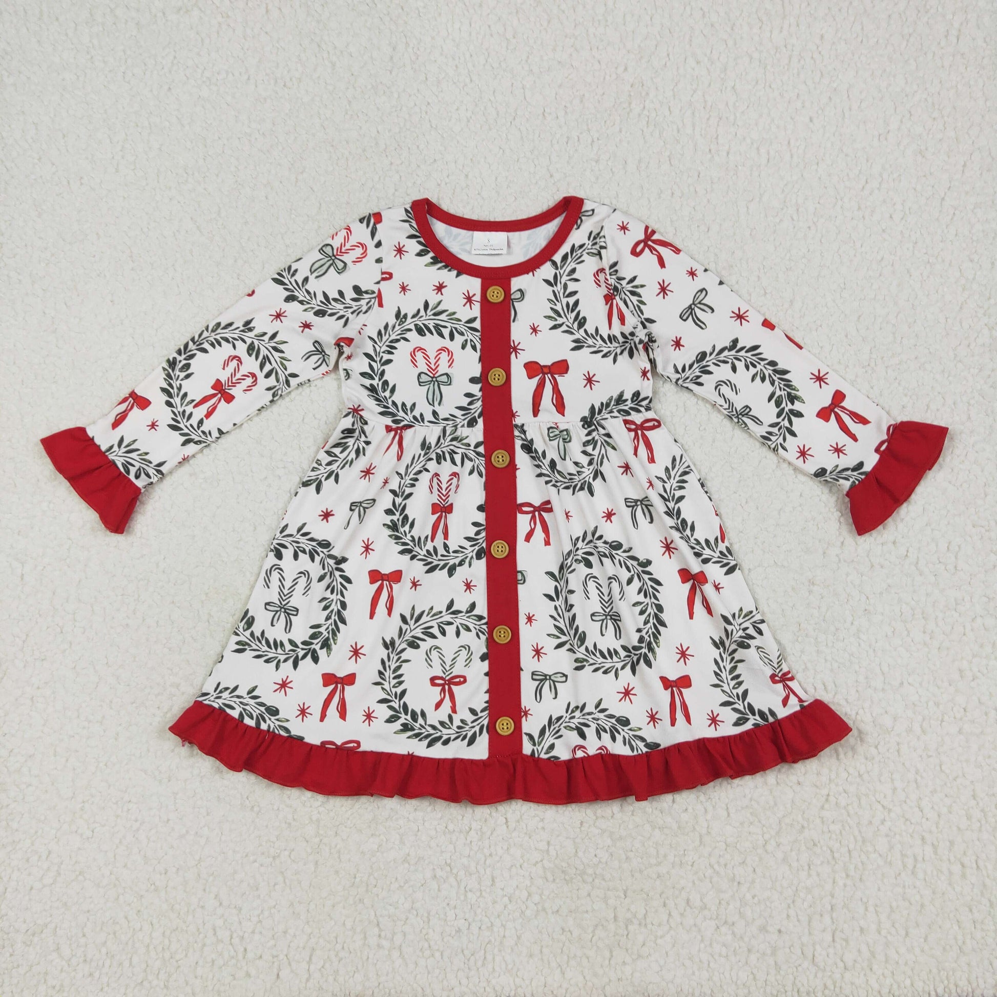RTS NO MOQ(In Stock ) GLD1082 Christmas wreath bow pattern red lace button long-sleeved dress