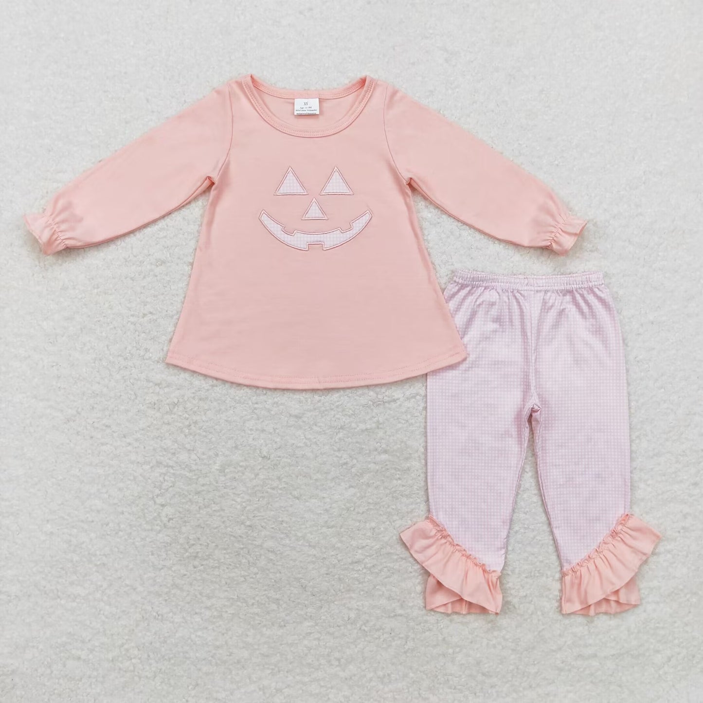 rts no moq GLP1342 embroidery Halloween smiley face pink long-sleeved plaid trousers set