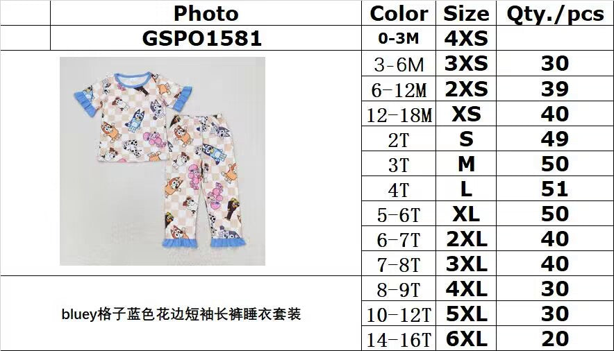 RTS NO MOQ GSPO1581 Bluey Plaid Blue Lace Short Sleeve Long Pants Pajama Set