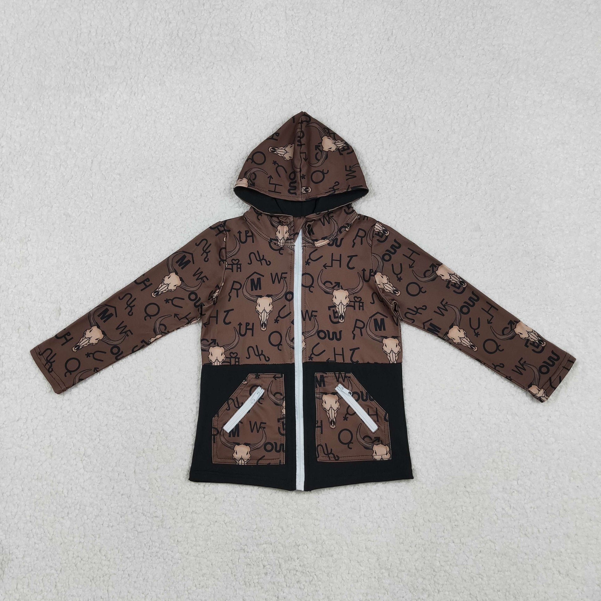 RTS NO MOQ(In Stock) Character Mountain Bull Head Brown Pocket Zipper Hooded Long-Sleeve Top