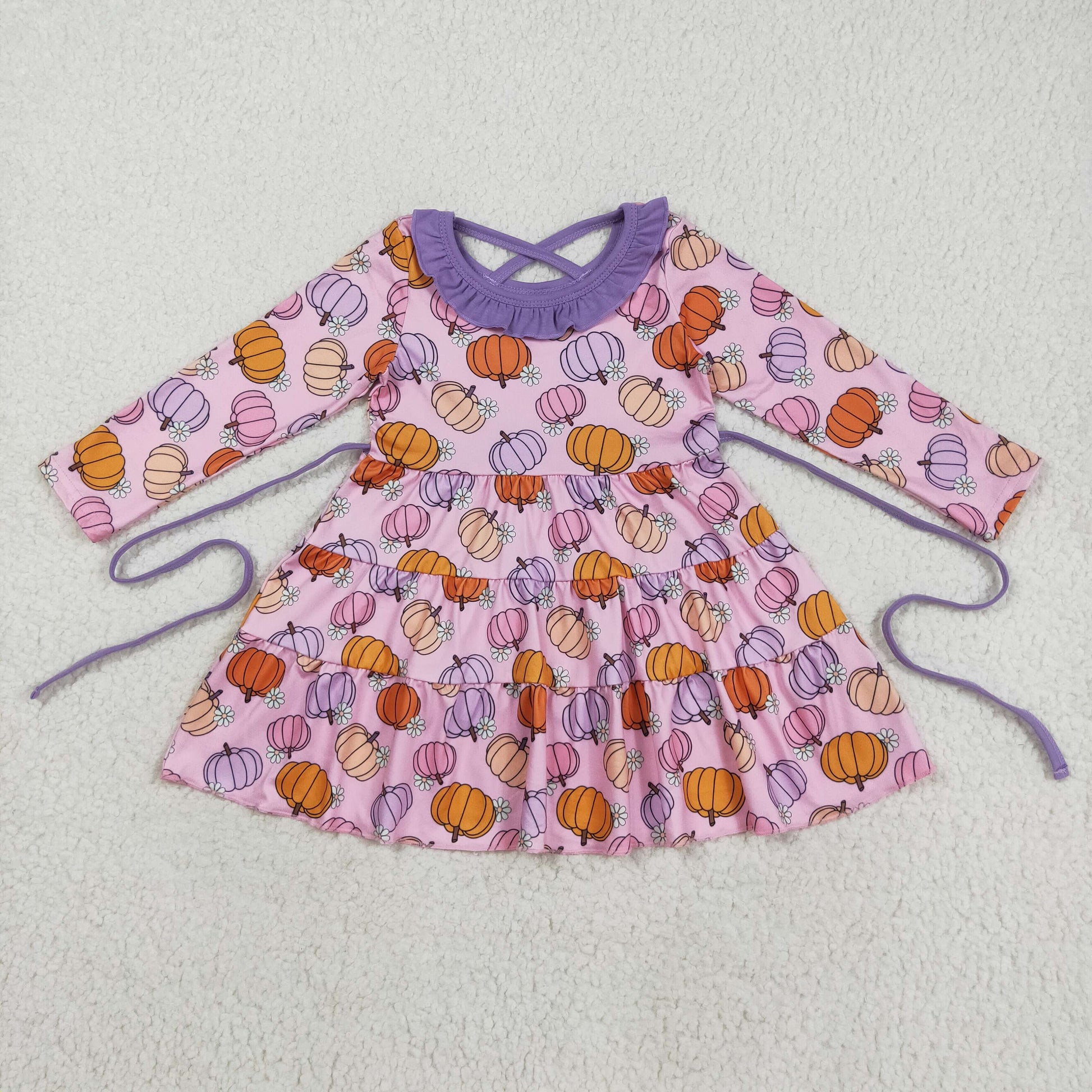 RTS NO MOQ(In Stock) GLD1032 Pumpkin Blossom Purple Lace Belt Long-Sleeved Pink Dress