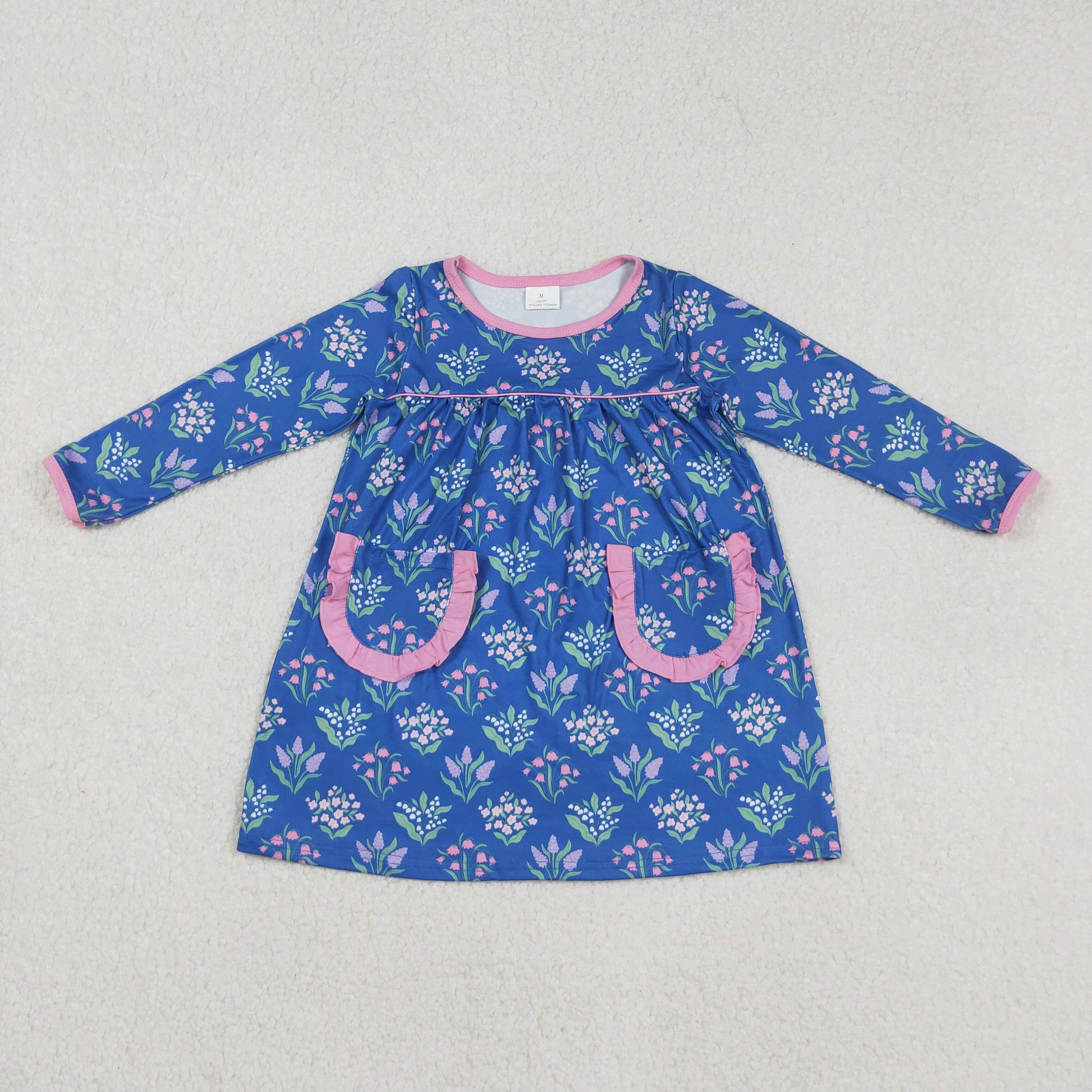 RTS NO MOQ(In Stock) GLD1257 Blue long-sleeved dress with floral lace pockets