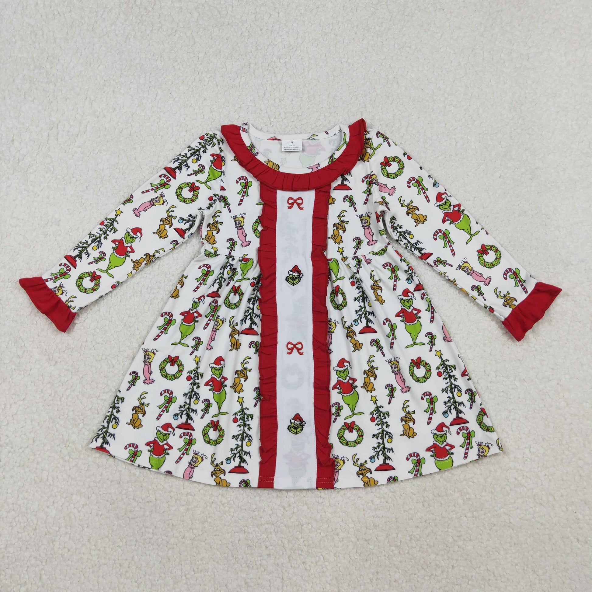 RTS NO MOQ(In Stock) GLD1289 Cartoon Embroidered Bow Pattern Wreath Red Lace White Long-Sleeved Dress