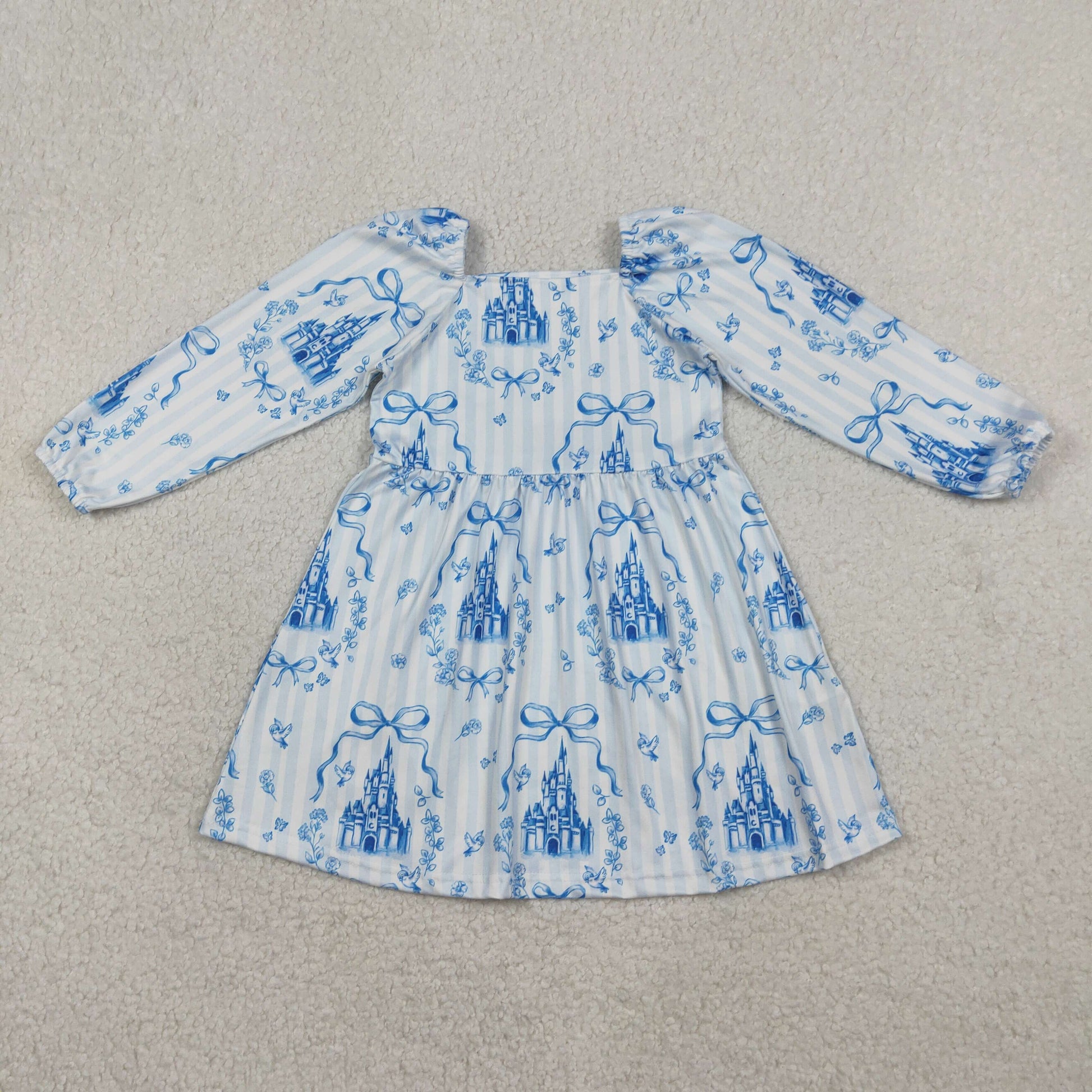 RTS NO MOQ(In Stock ) GLD1567 Bow Pattern Castle Blue Vertical Striped Long-Sleeve Dress