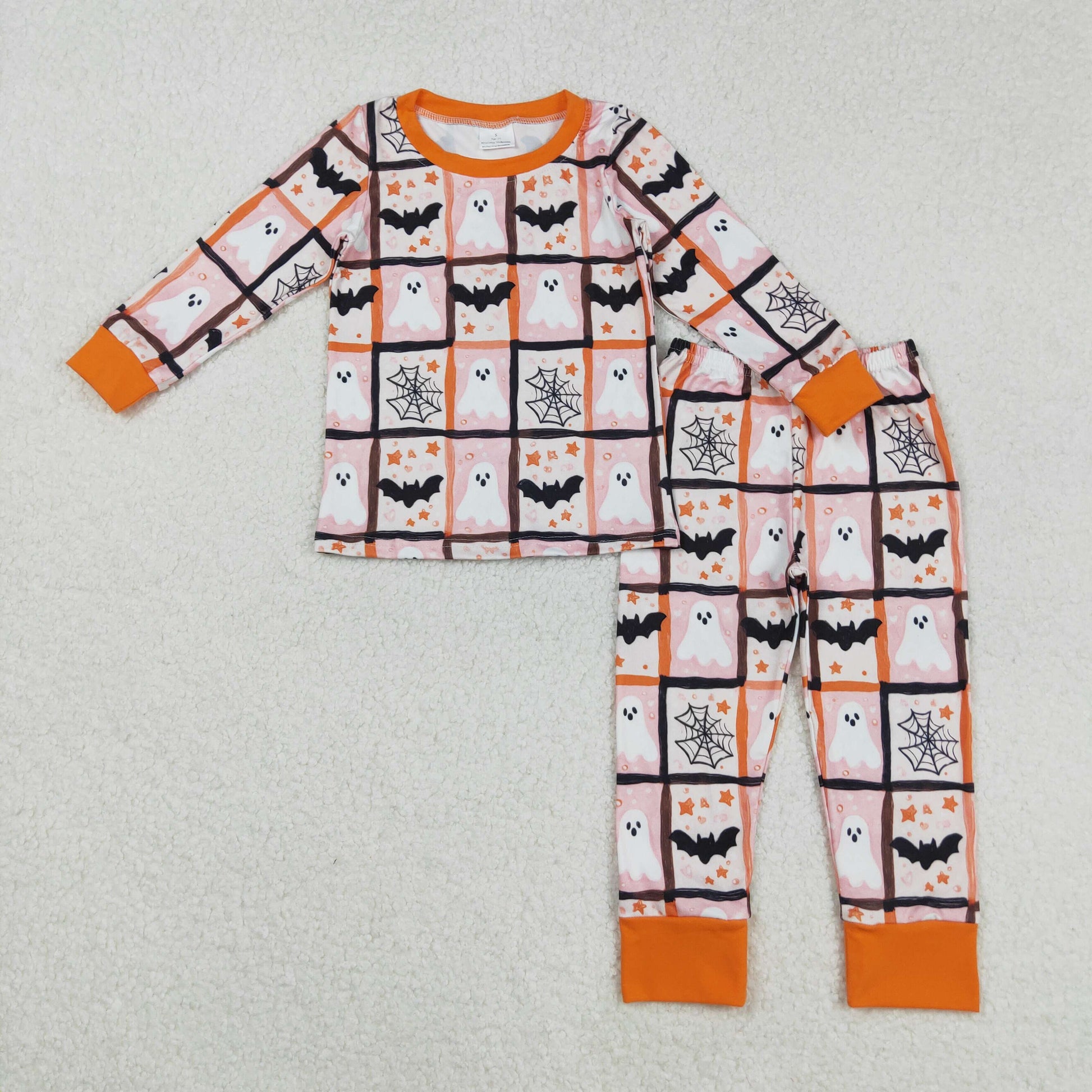 RTS NO MOQ(In Stock) GLP2682 Halloween Ghost Bat Spider Mesh Pink and Orange Long-Sleeved Pants Pajama Set