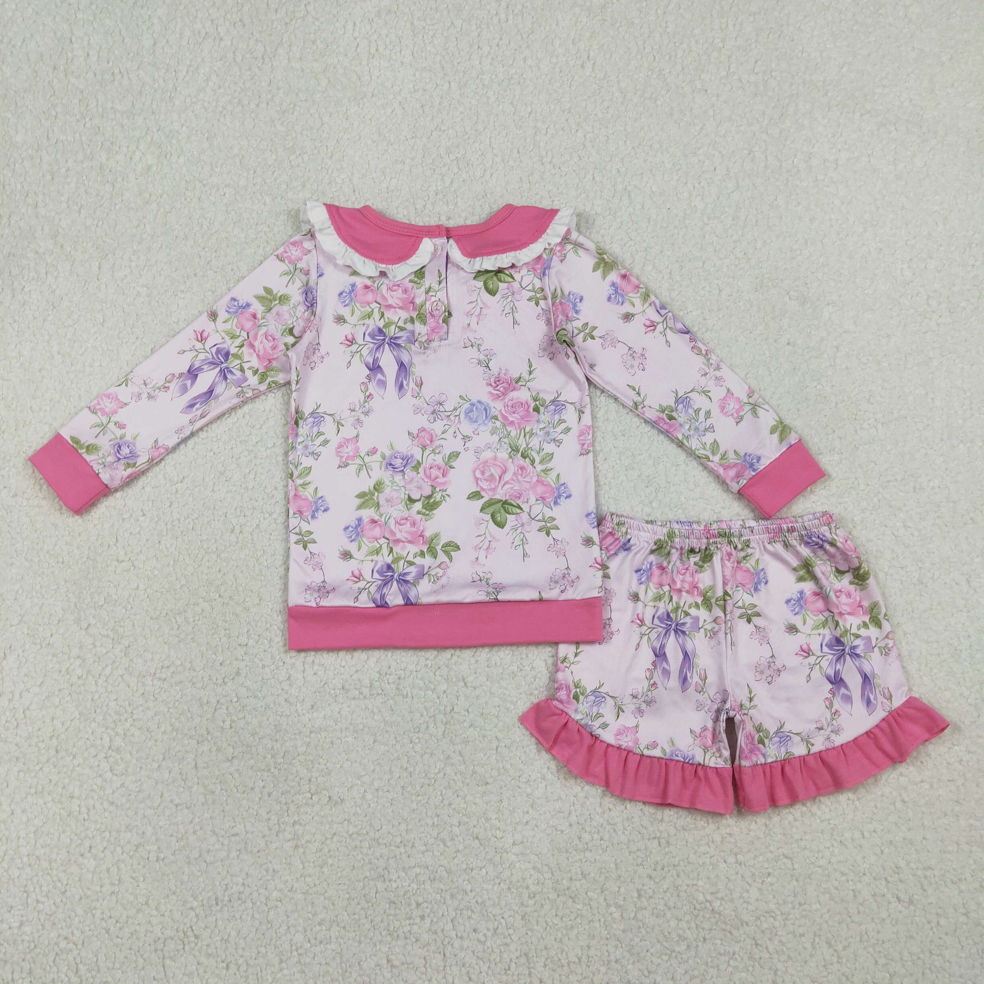 RTS NO MOQ(In Stock) GLS0082 Floral and Leaf Rose Red Lace Peter Pan Collar Long Sleeve Shorts Set