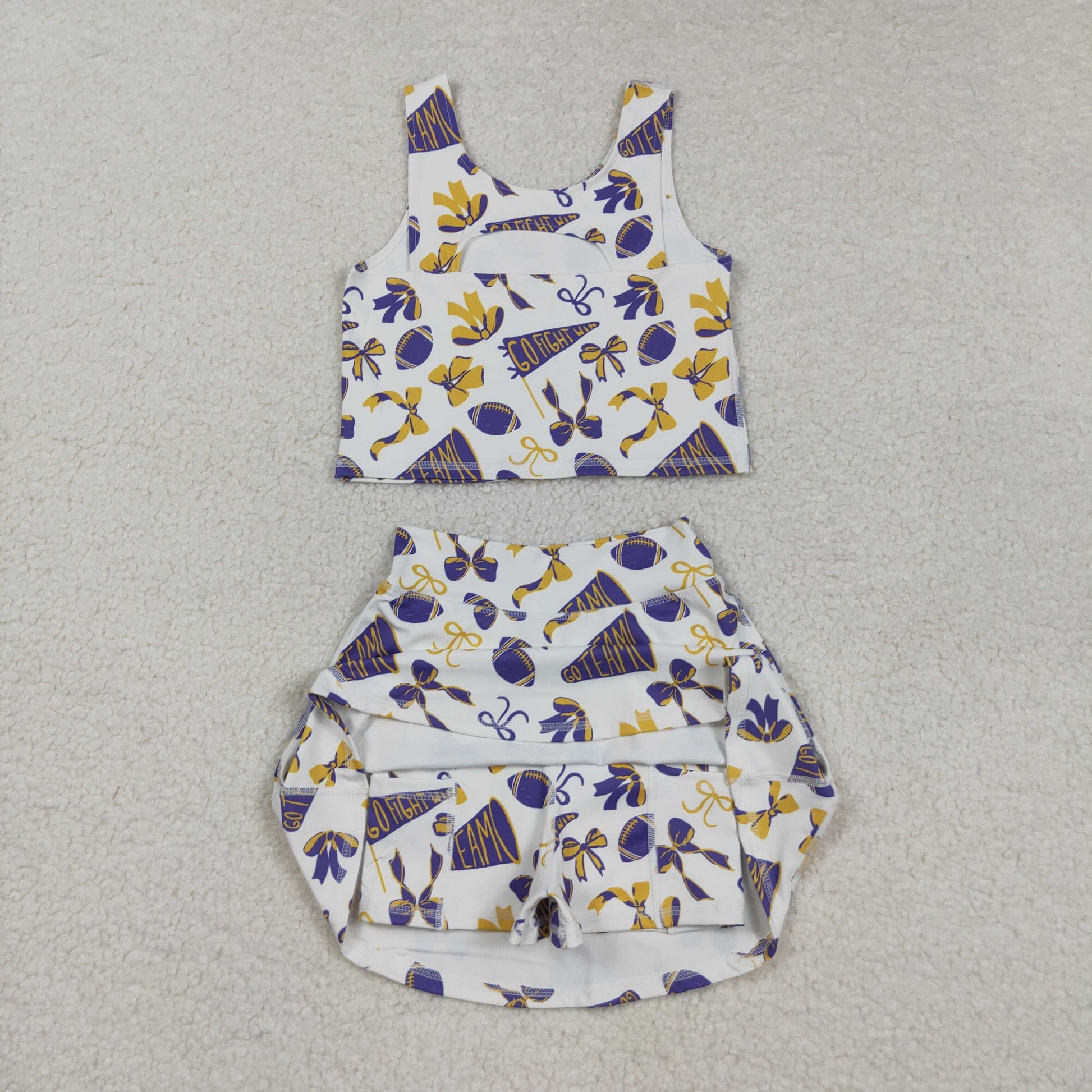 RTS NO MOQ(In Stock) GSD2690 Go Fight Purple Flared Bow Pattern Sleeveless Skirt Yoga Set