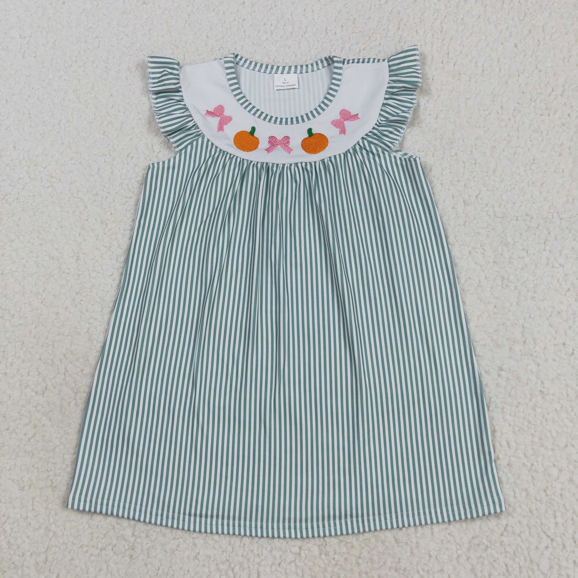 RTS NO MOQ(In Stock)GSD2746 Embroidered butterfly pattern pumpkin green striped dress with flying sleeves