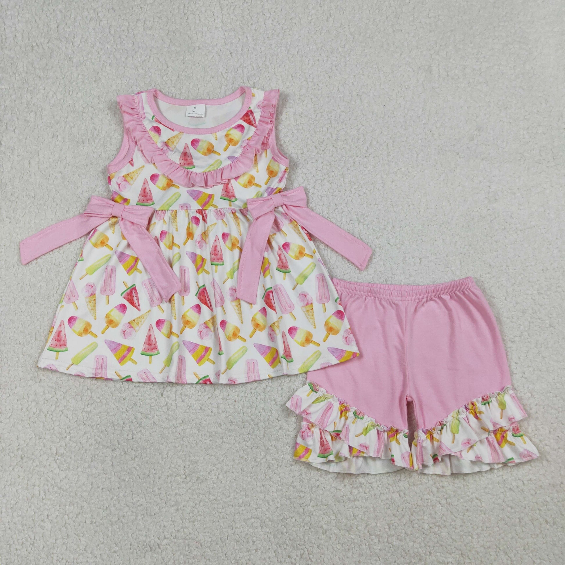 RTS NO MOQ(In Stock) GSSO3067 Ice Cream Stick Pink Lace Bow White Sleeveless Shorts Set