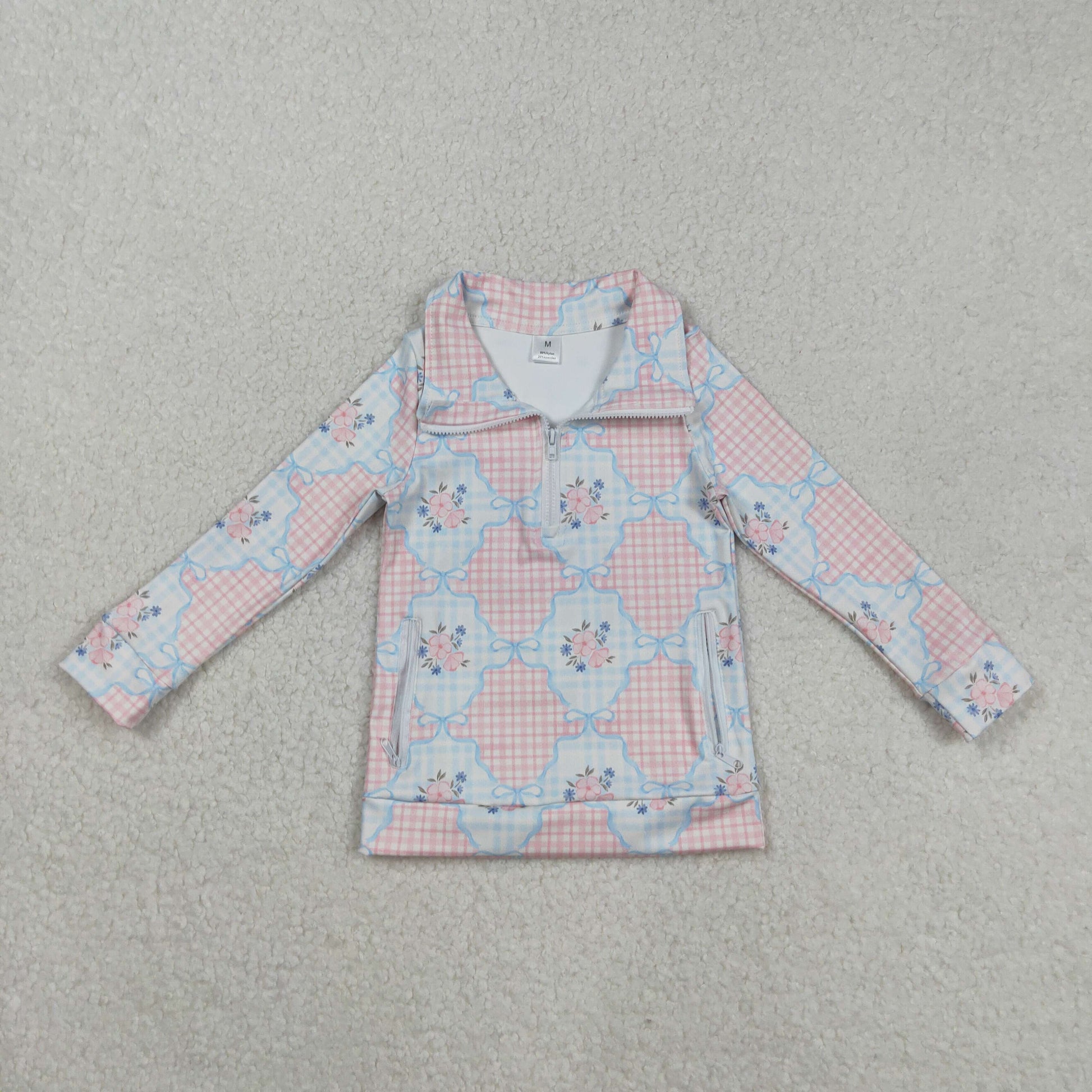 RTS NO MOQ(In Stock) GT1062 Floral Plaid Bow Pattern Yoga Zipper Long-Sleeved Top