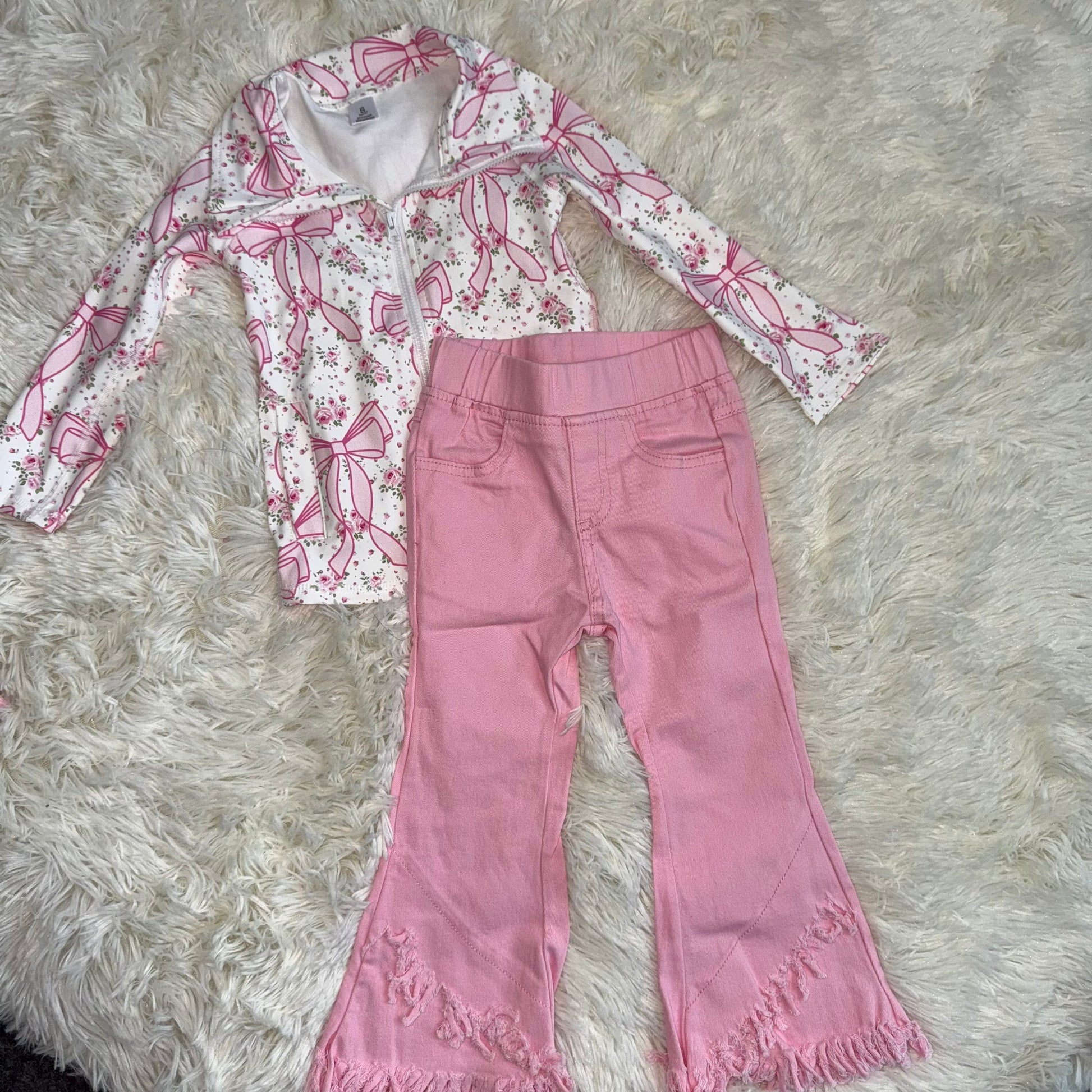 RTS NO MOQ(In Stock) GT1082+P0463 yoga floral bow zipper long sleeve top Pink tassel elastic waist denim pants sets