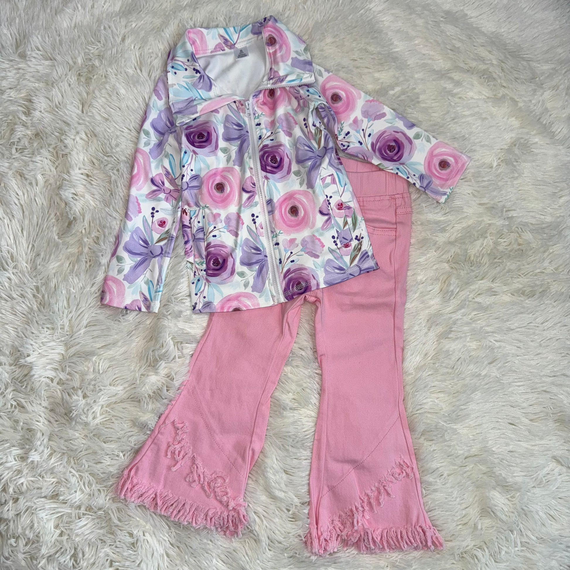 RTS NO MOQ(In Stock) GT1083+P0463 yoga floral bow long sleeve top Pink tassel elastic waist denim pants sets