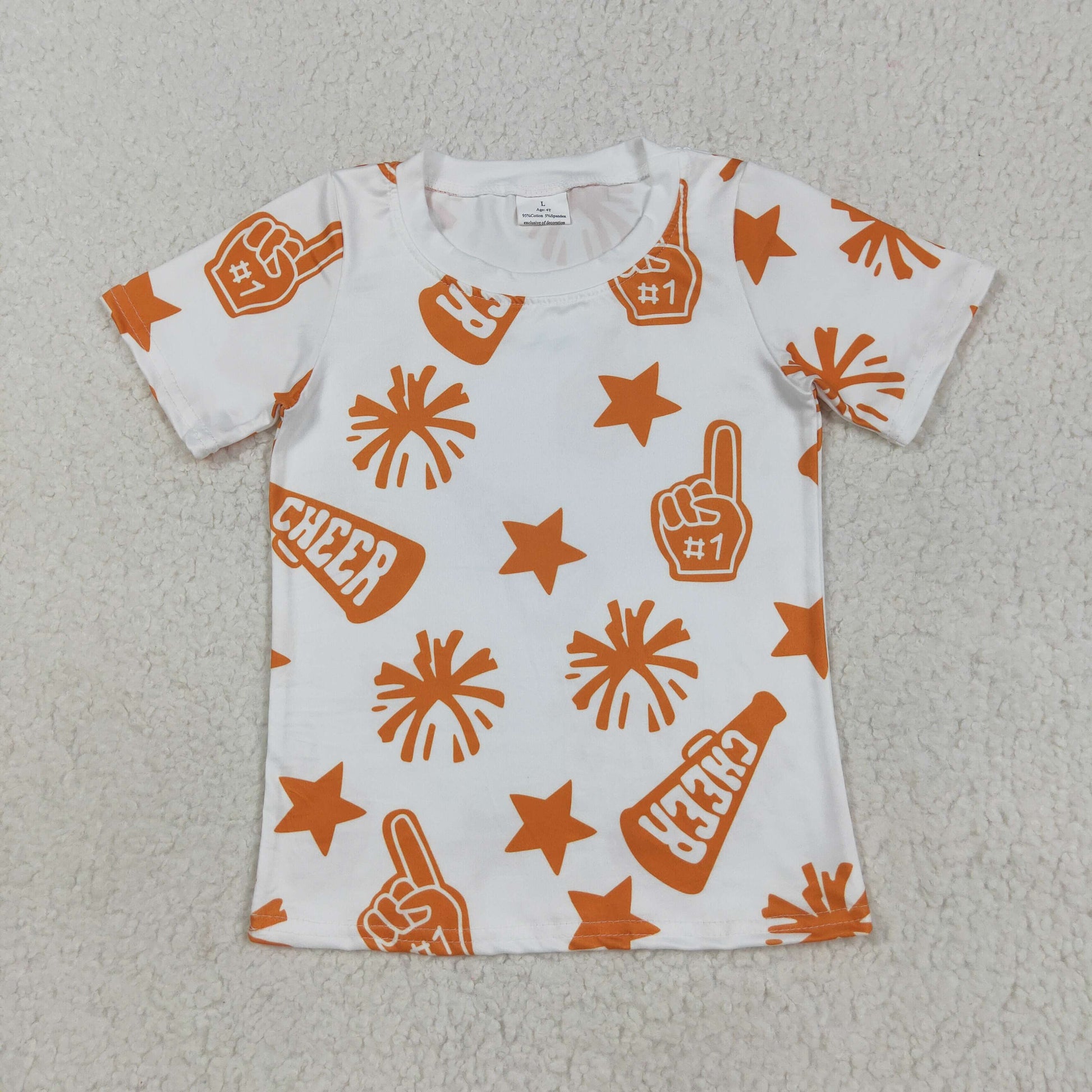 RTS NO MOQ(In Stock) GT1090 Cheer orange fireworks star white short-sleeved top