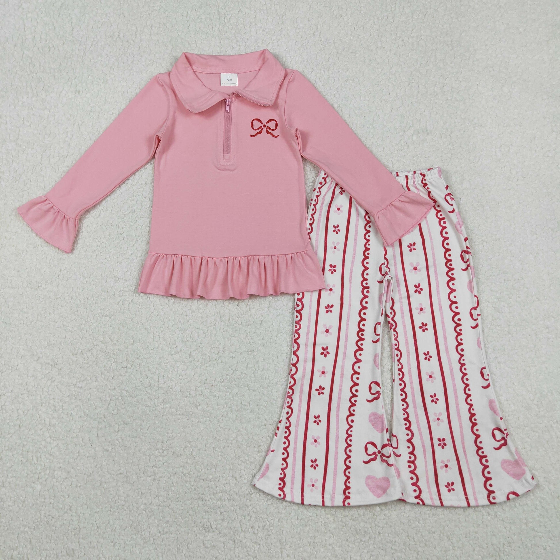 RTS NO MOQ(In Stock ) GT1270+P0894 Embroidered Red Bow Pink Lace Zipper Long-Sleeve Top Heart Pants set-GLP2934