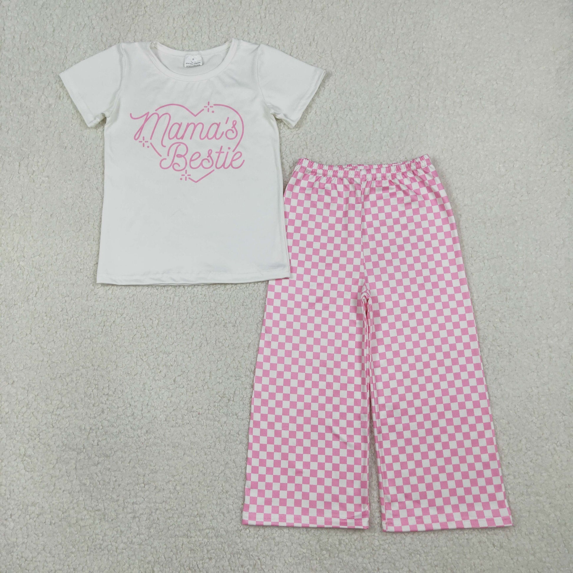 RTS NO MOQ(In Stock) GT1565+P1018 Mama's Bestie Letter White Short-Sleeve Top Pink Plaid Pants set