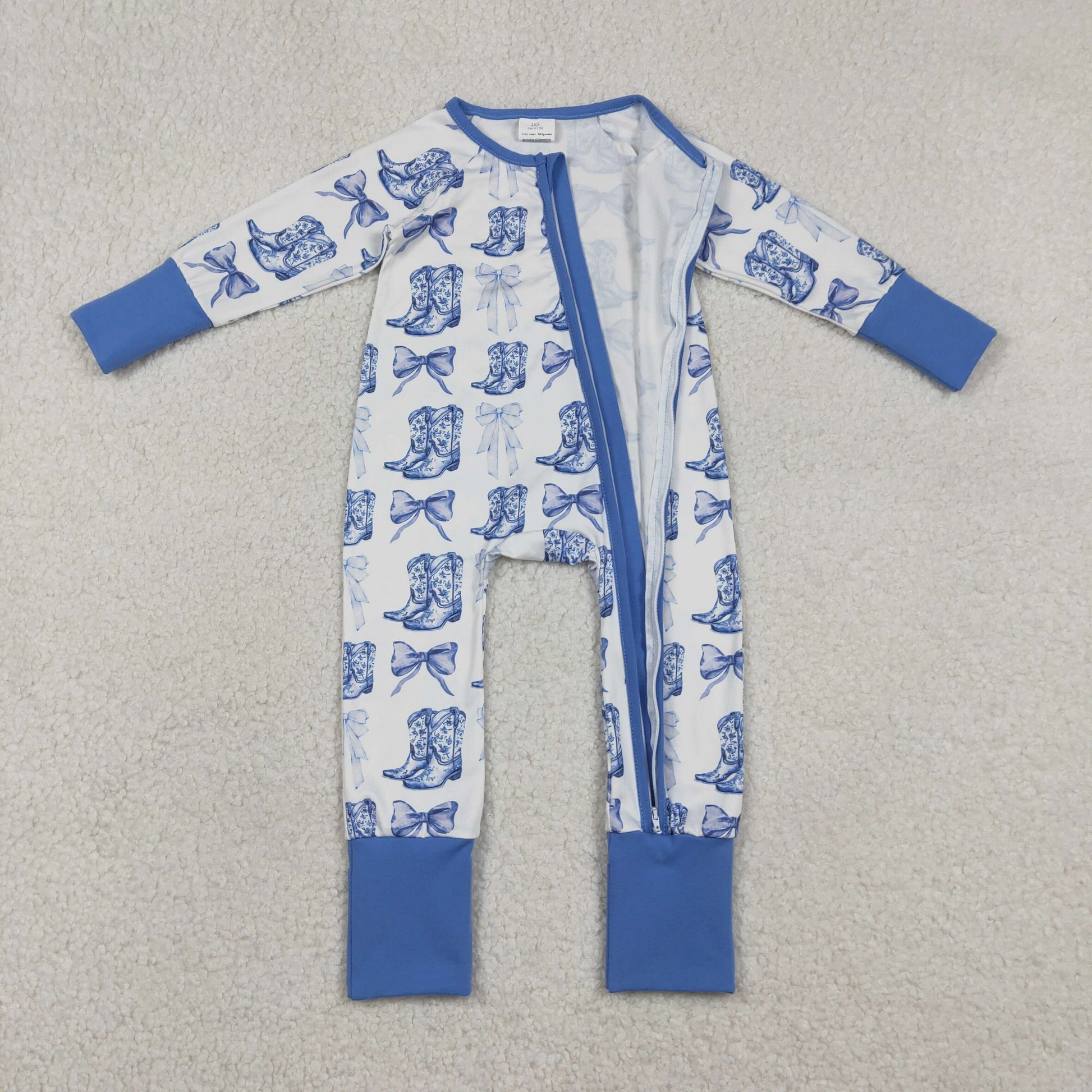 RTS NO MOQ(In Stock ) Boots and Bow Pattern Blue and White Zipper Long-Sleeve Jumpsuit