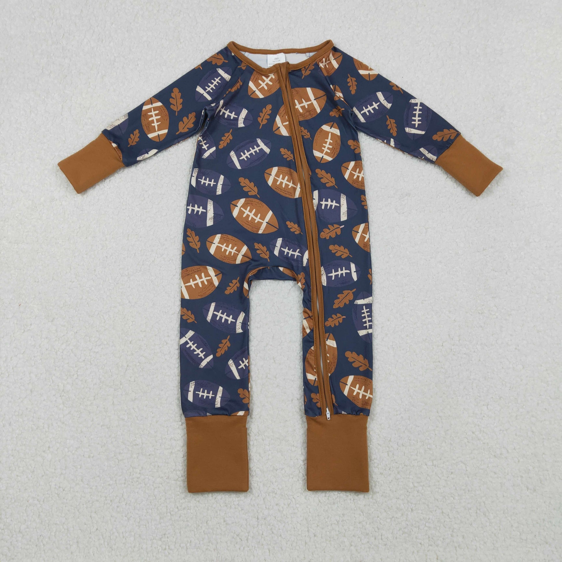 RTS NO MOQ(In Stock) LR2543 Rugby leaf brown and blue zippered long-sleeved bodysuit