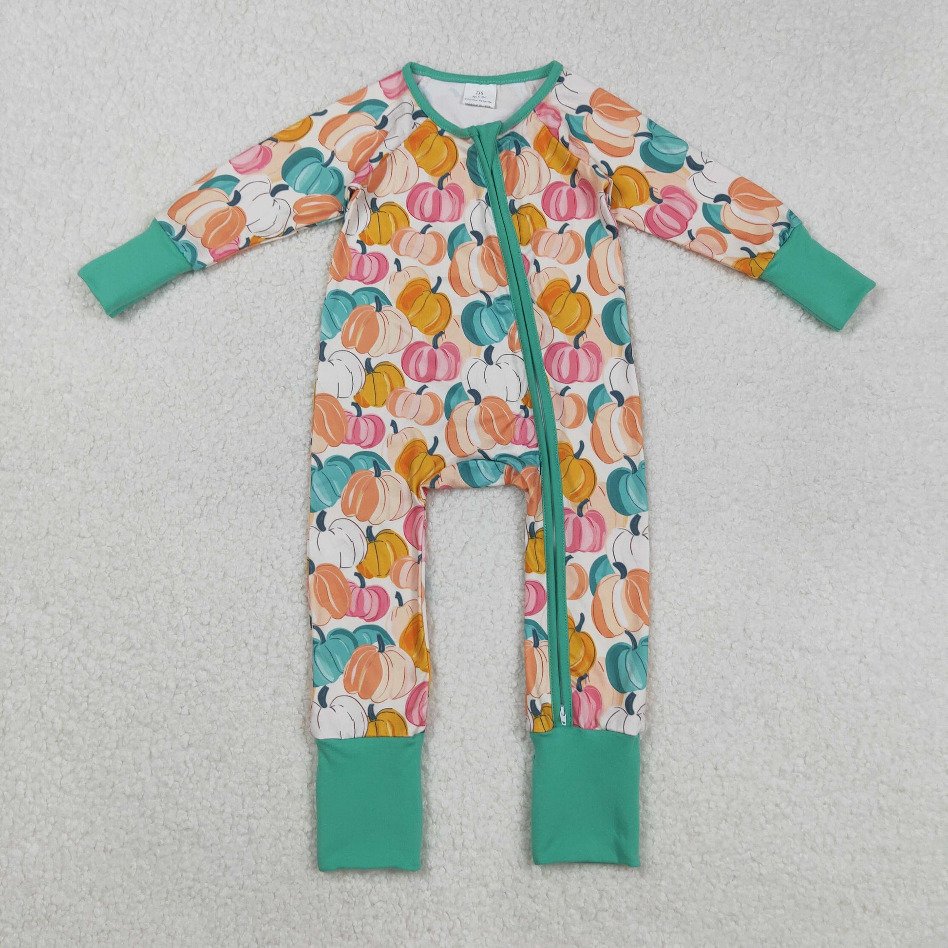 RTS NO MOQ(In Stock) LR2552 Beige long-sleeved zip-up bodysuit with pumpkin pattern