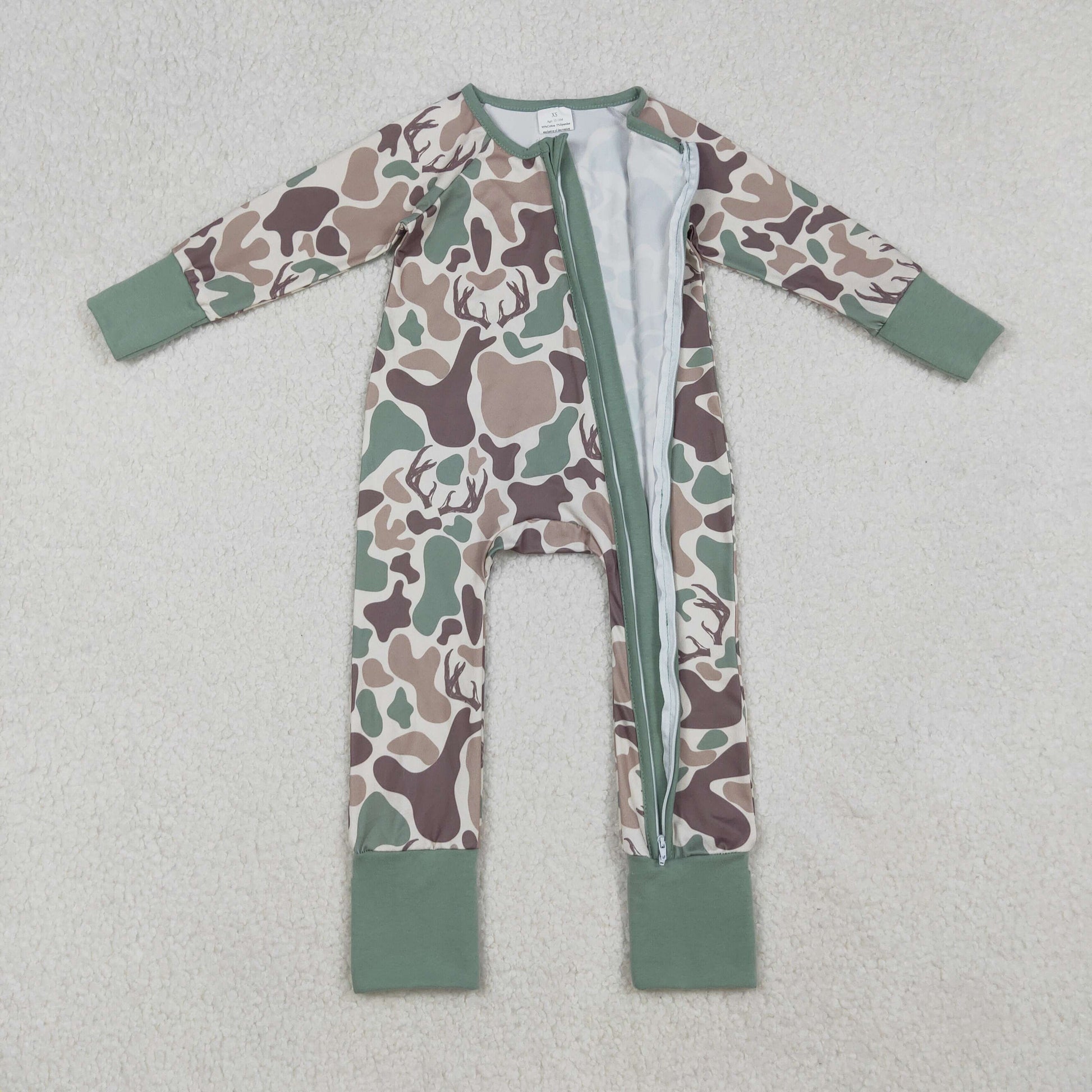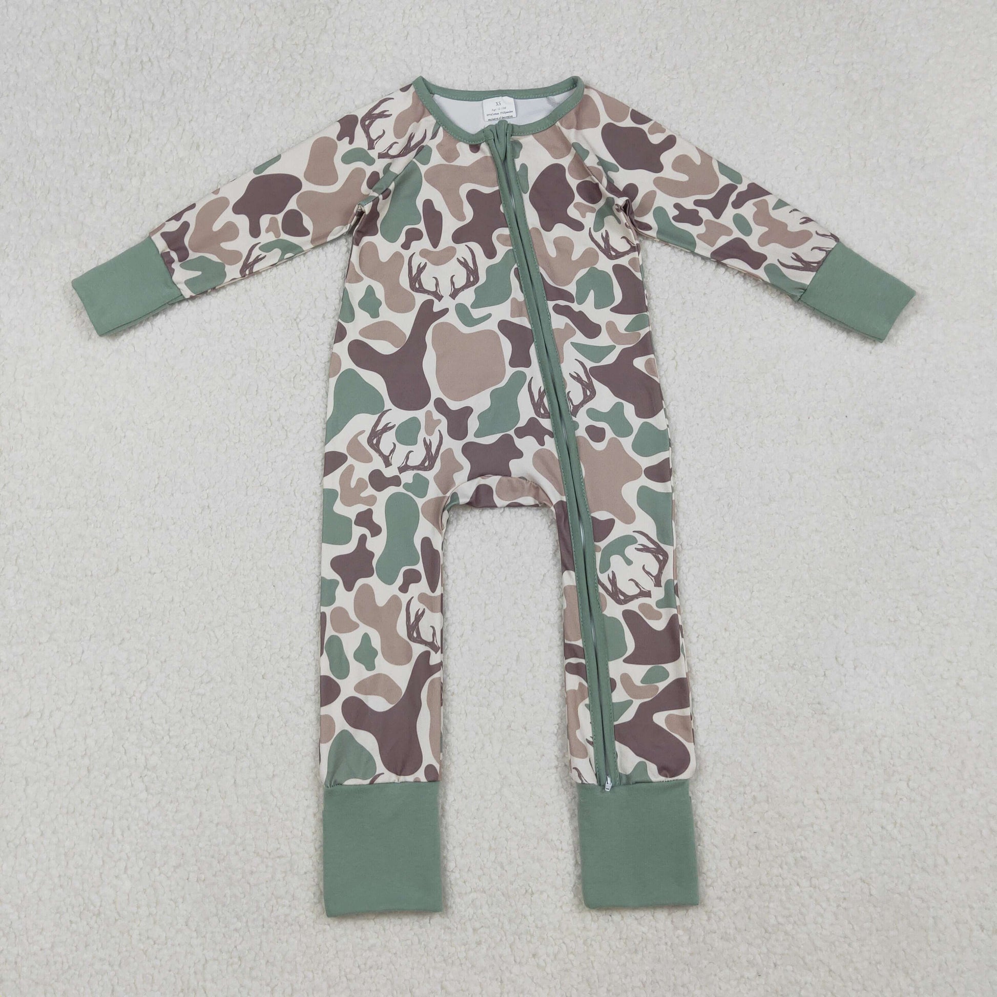 RTS NO MOQ(In Stock) Deer antler brown and green camouflage zipper long-sleeved bodysuit