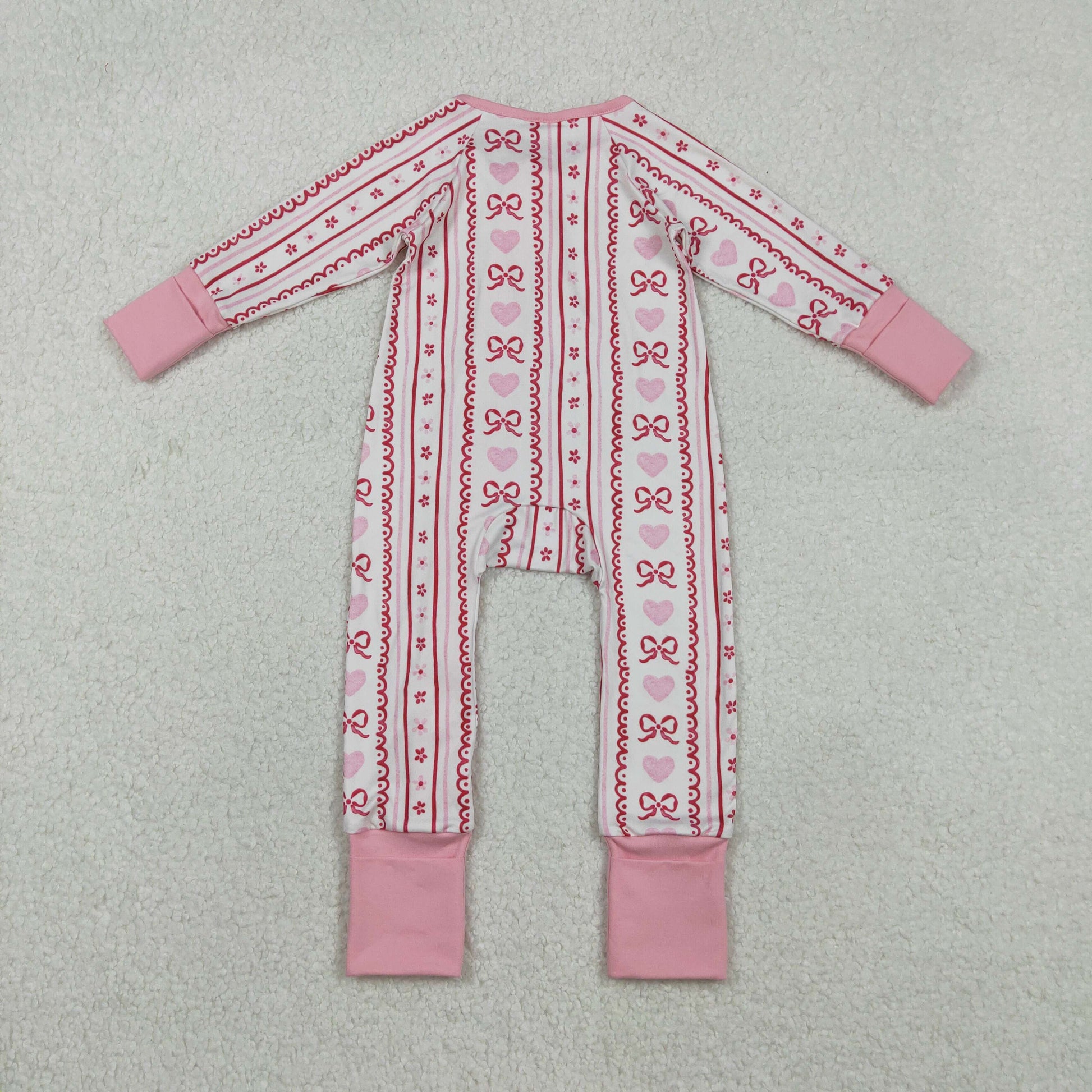 RTS NO MOQ(In Stock ) LR2781 Heart-Bow Pattern Floral Striped Beige Zipper Long-Sleeved Jumpsuit