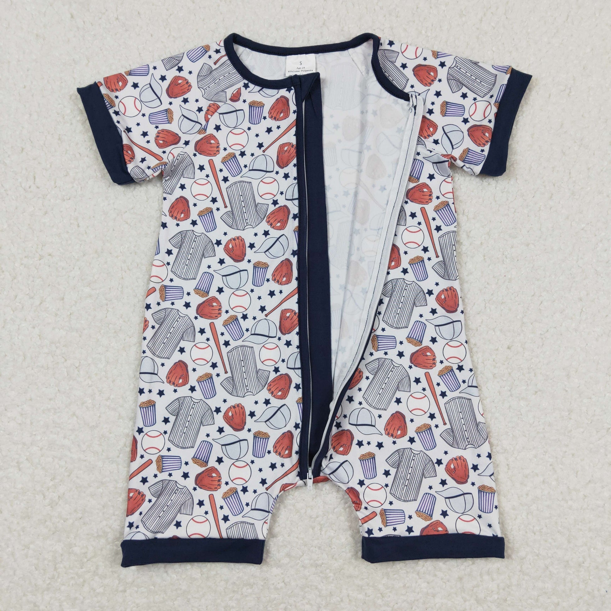 RTS NO MOQ(In Stock) Baseball star gloves blue trim short sleeve zipper jumpsuit