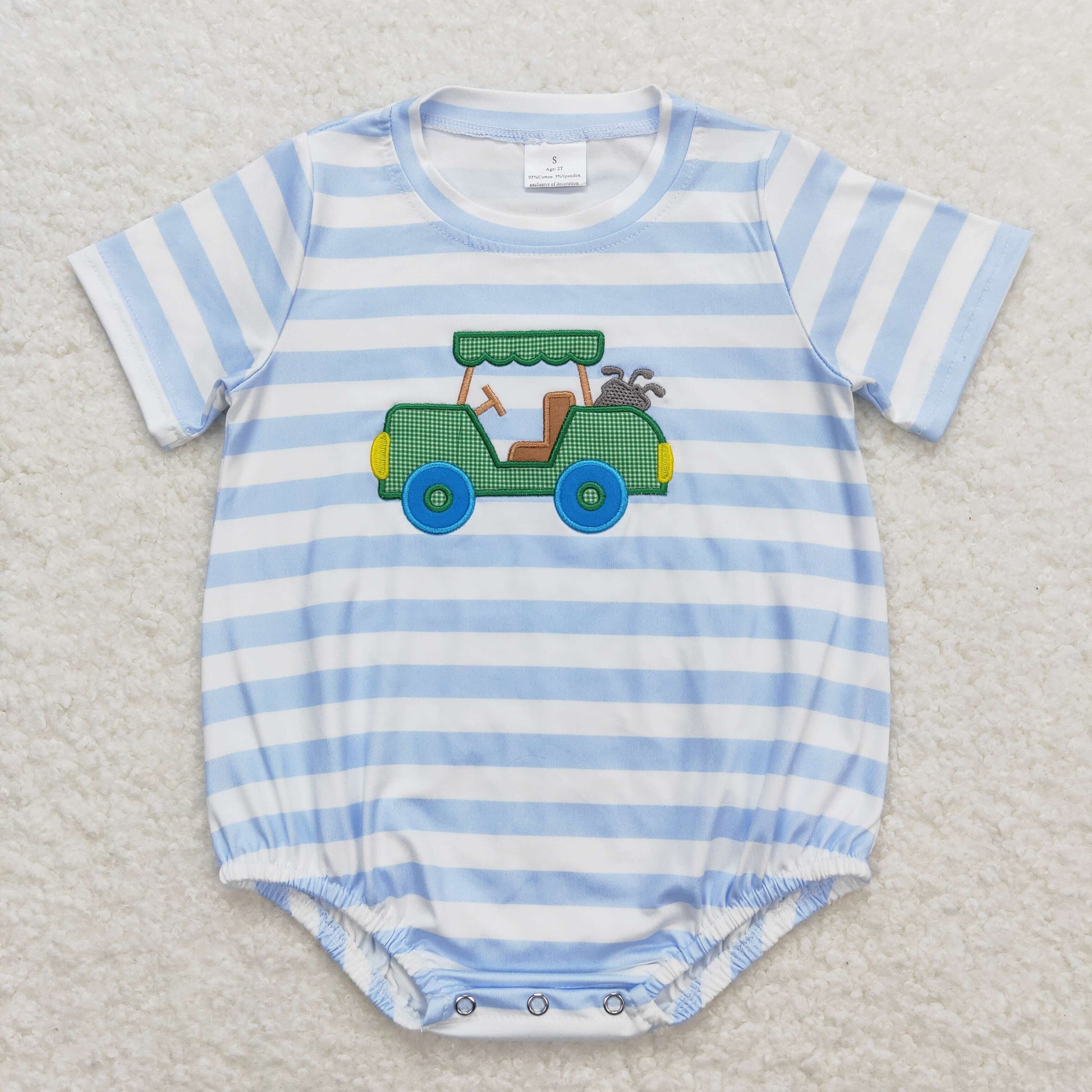 RTS NO MOQ(In Stock) SR0795 Embroidery Golf Sightseeing Car Blue and White Striped Short Sleeve Jumpsuit