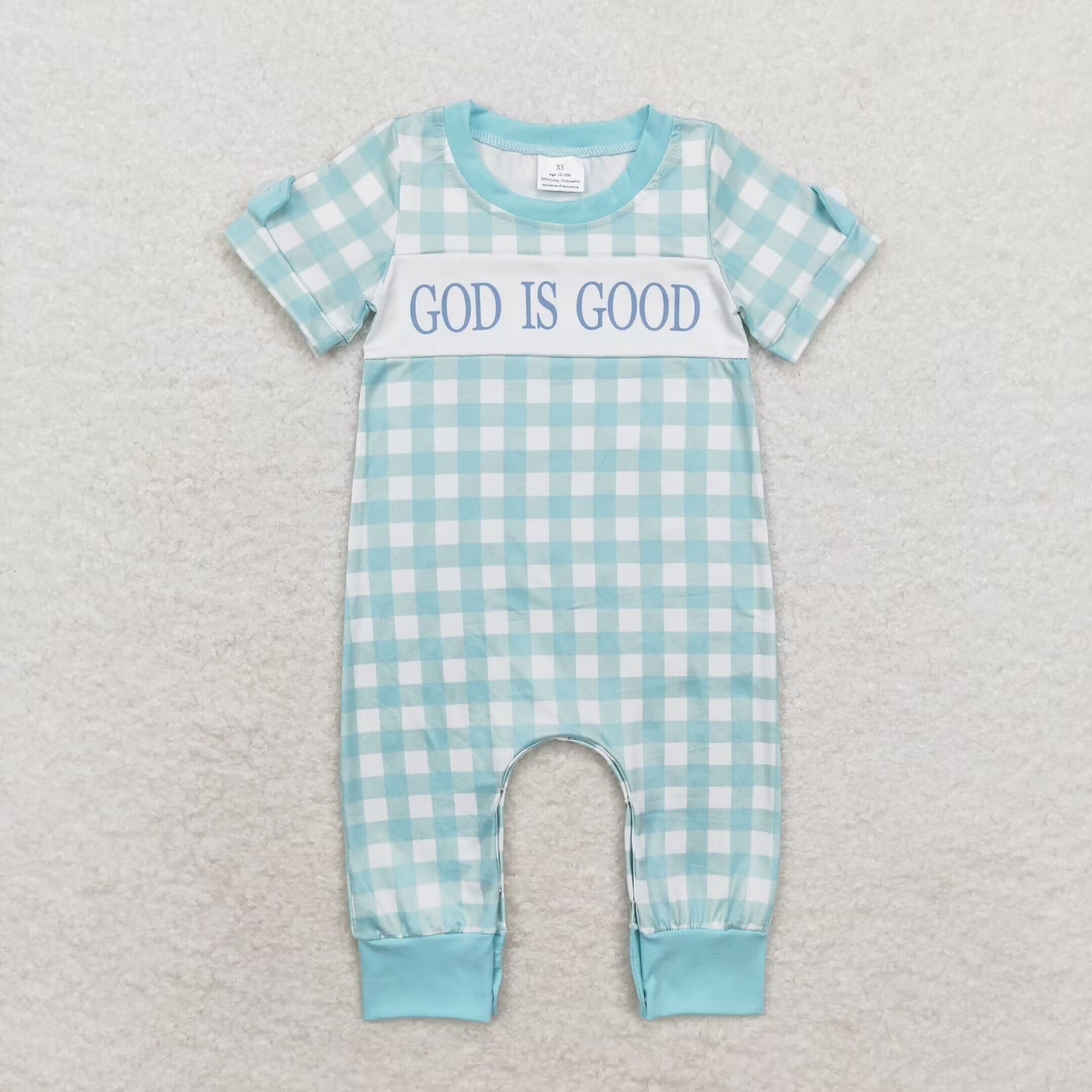 RTS NO MOQ(In Stock) god is good plaid blue green short sleeve jumpsuit