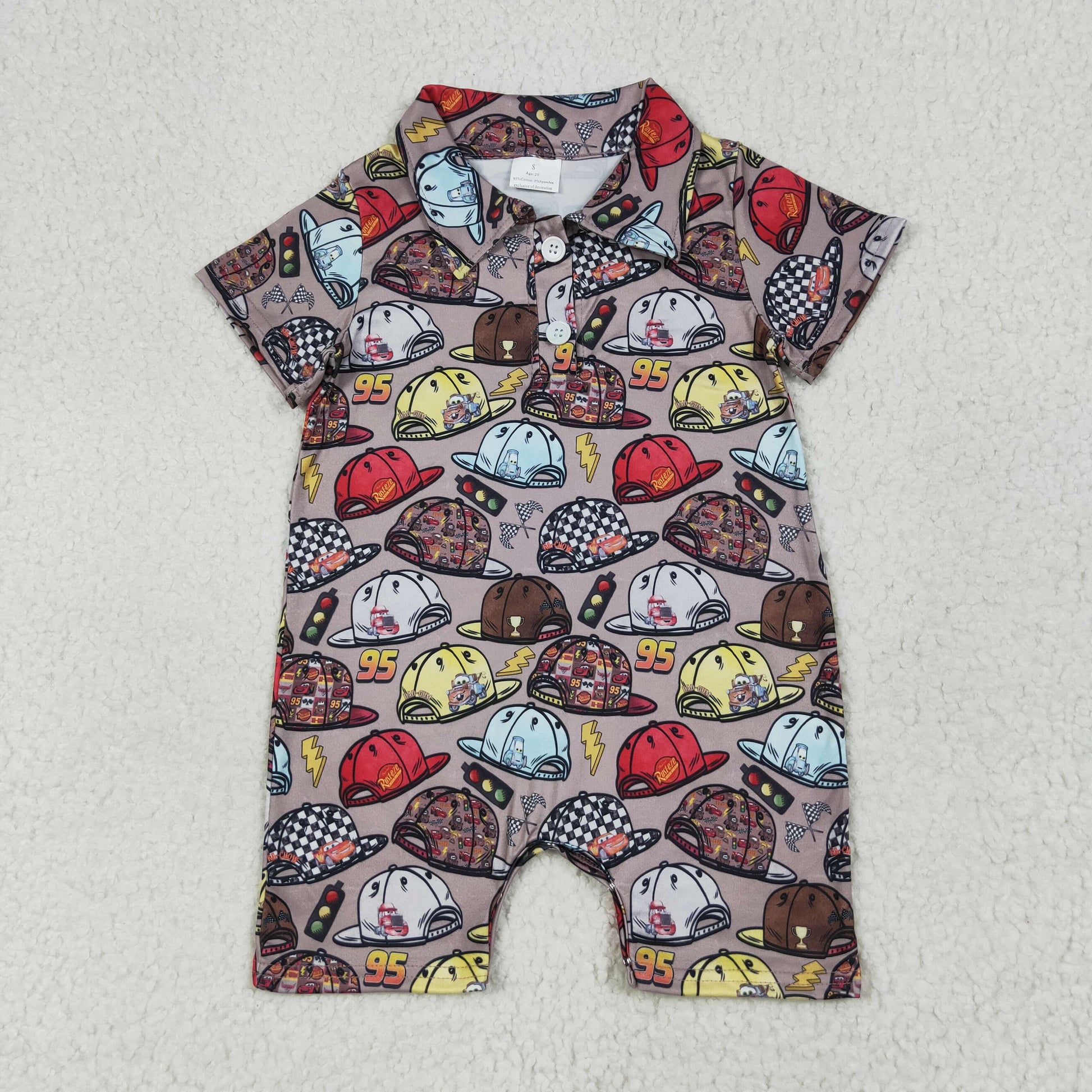RTS NO MOQ(In Stock ) cars cartoon car hat brown short-sleeved jumpsuit