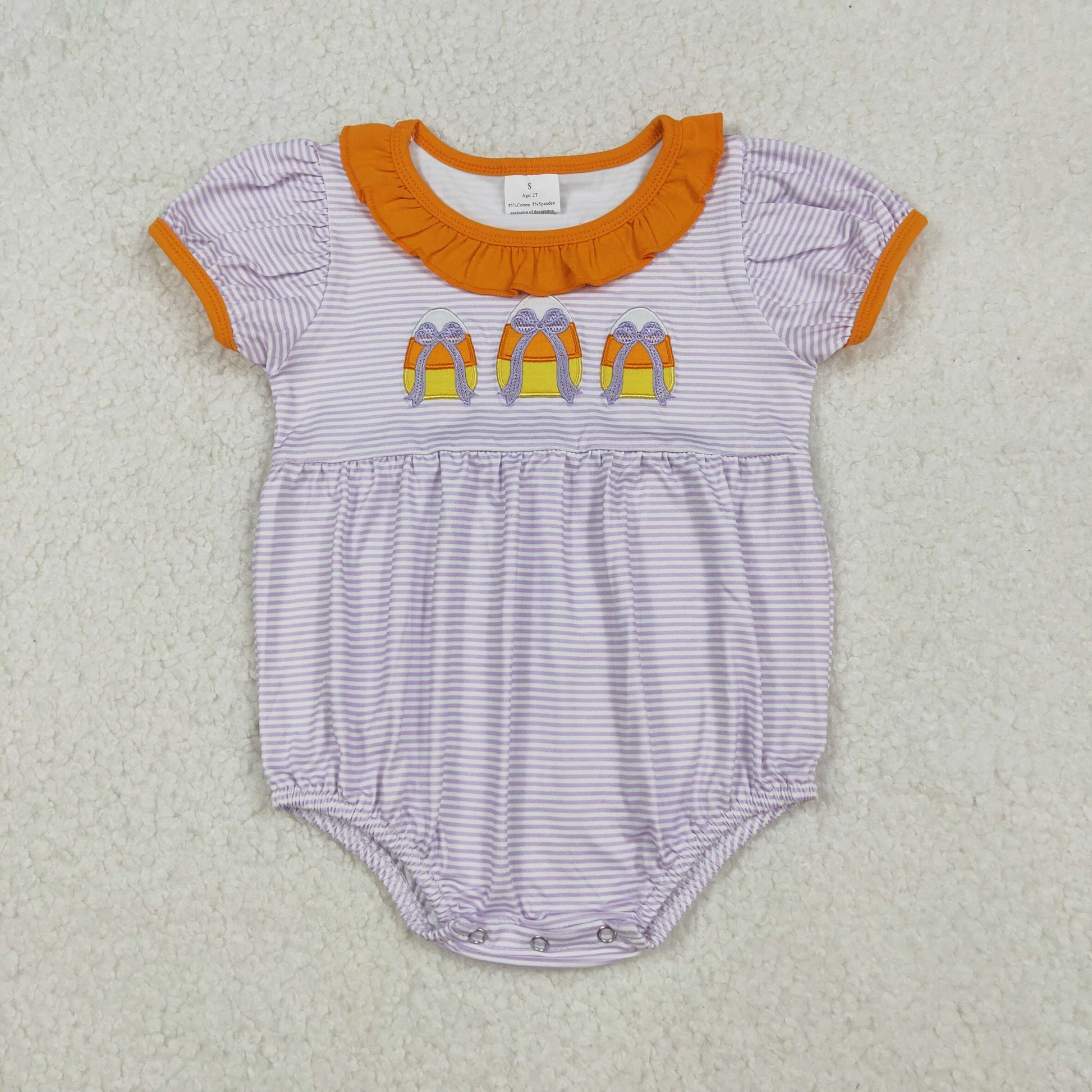 RTS NO MOQ(In Stock) SR3202 Purple short-sleeved bodysuit with embroidered Halloween candy bow pattern with orange lace pockets
