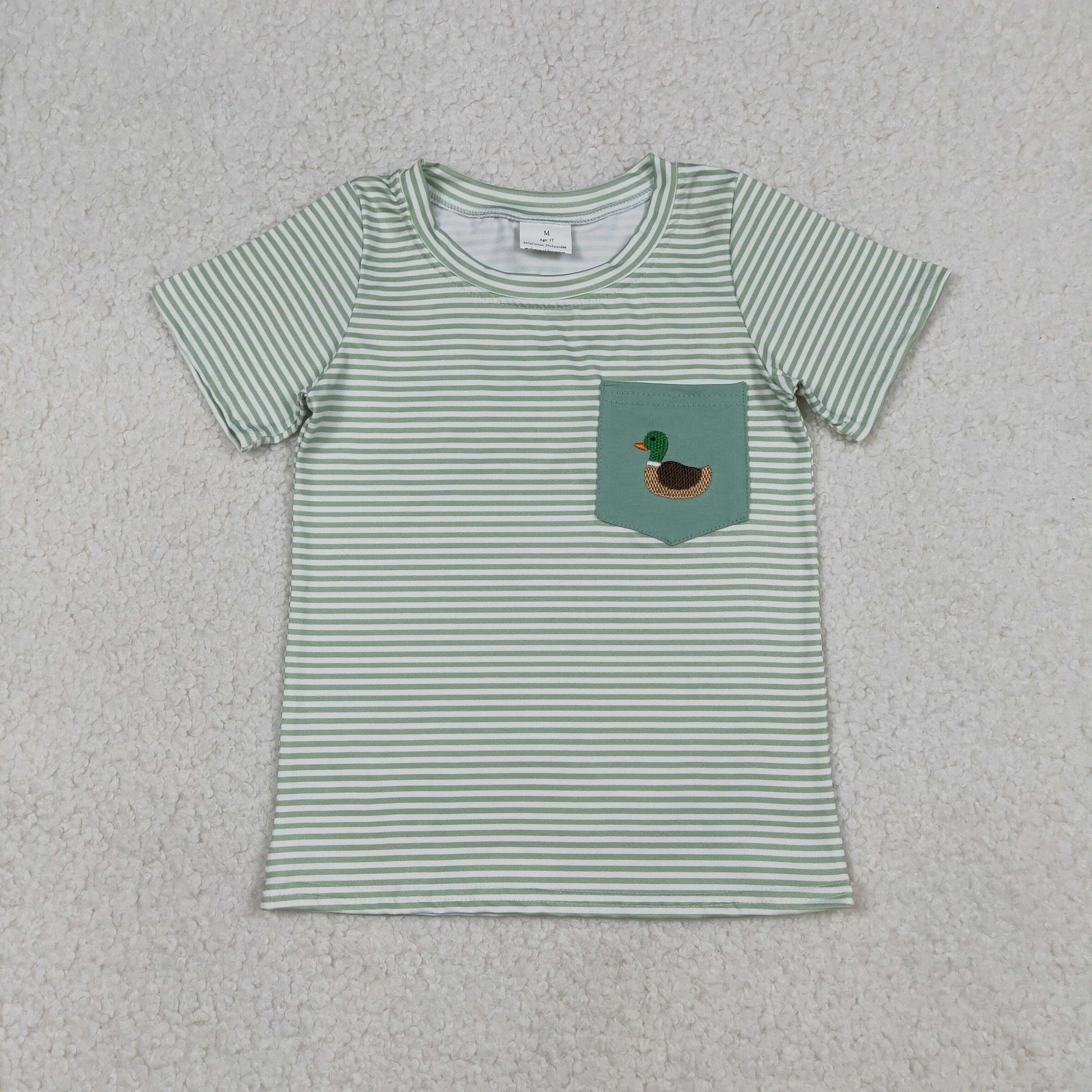 RTS NO MOQ(In Stock) Embroidered Duck Pocket Green Striped Short-Sleeve Top