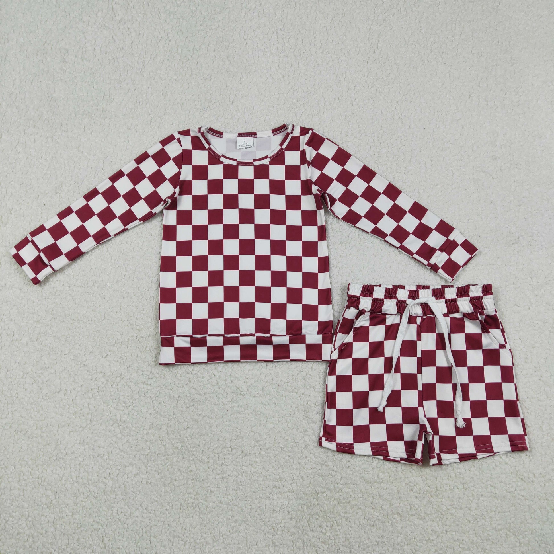 RTS NO MOQ(In Stock) Dark Red Plaid Long-Sleeve Shorts Set