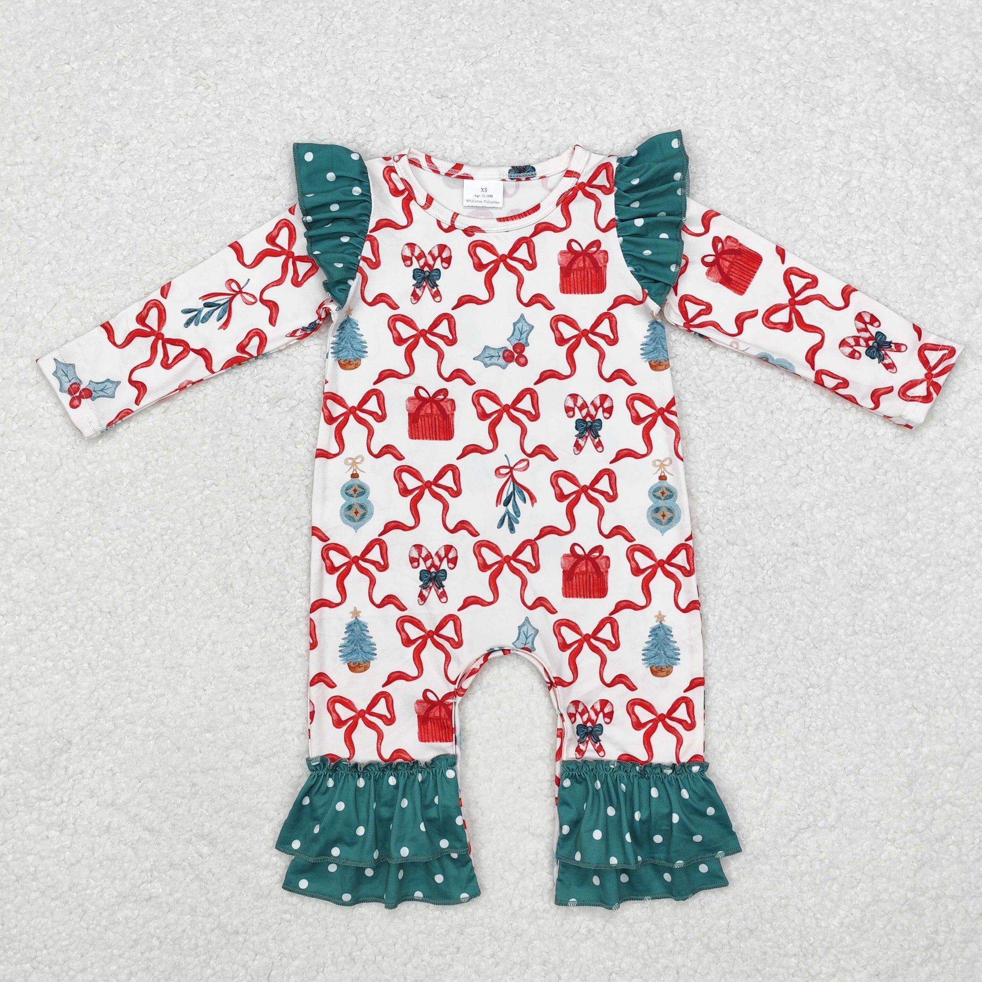 RTS NO MOQ ETA 5/7days LR1285 Christmas bow cane pattern polka dot green lace long sleeve jumpsuit